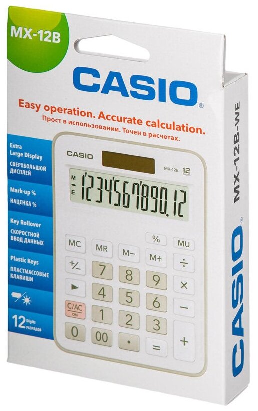 Калькулятор бухгалтерский Casio MX-12B-WE – функциональное устройство, которое позволяет производить сложные расчеты, благодаря чему является желанным приобретением для офисных работников и всех, кто работает с числовыми данными. Настольный калькулятор позволяет рассчитывать проценты и поддерживает функцию наценки, поэтому он идеально подходит для сотрудников банков и коммерческих организаций. Модель обладает независимой памятью M+, M-, MR, MC и для комфортного восприятия чисел предусматривает наличие разделителя групп разрядов, что позволяет большие числа выводить на экран по 3 цифры., Casio MX-12B-WE позволяет осуществлять коррекция ввода и сменят знаки +/-, для чего предусмотрена специальная клавиша. 12-разрядный калькулятор выполнен в белом корпусе, предполагает широкий дисплей и большие кнопки, на которые будет удобно нажимать при быстром вводе цифр. Особенность модели в поддержке двойного питания – от батареек LR1130 или солнечного элемента, который поддерживает перезарядку.