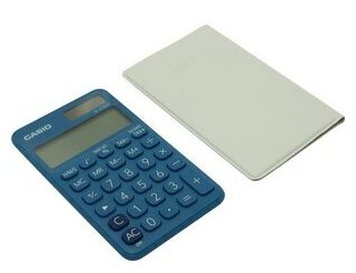 Калькулятор бухгалтерский Casio десятиразрядный. Для удобства восприятия цифры делятся на группы по 3 элемента. Он выполняет 8 функций, среди которых есть специфические бухгалтерские (вычисление налогов и маржи). Ярко-голубой пластиковый корпус прекрасно заметен на рабочем столе, поэтому калькулятор не придется подолгу искать среди документов и папок.