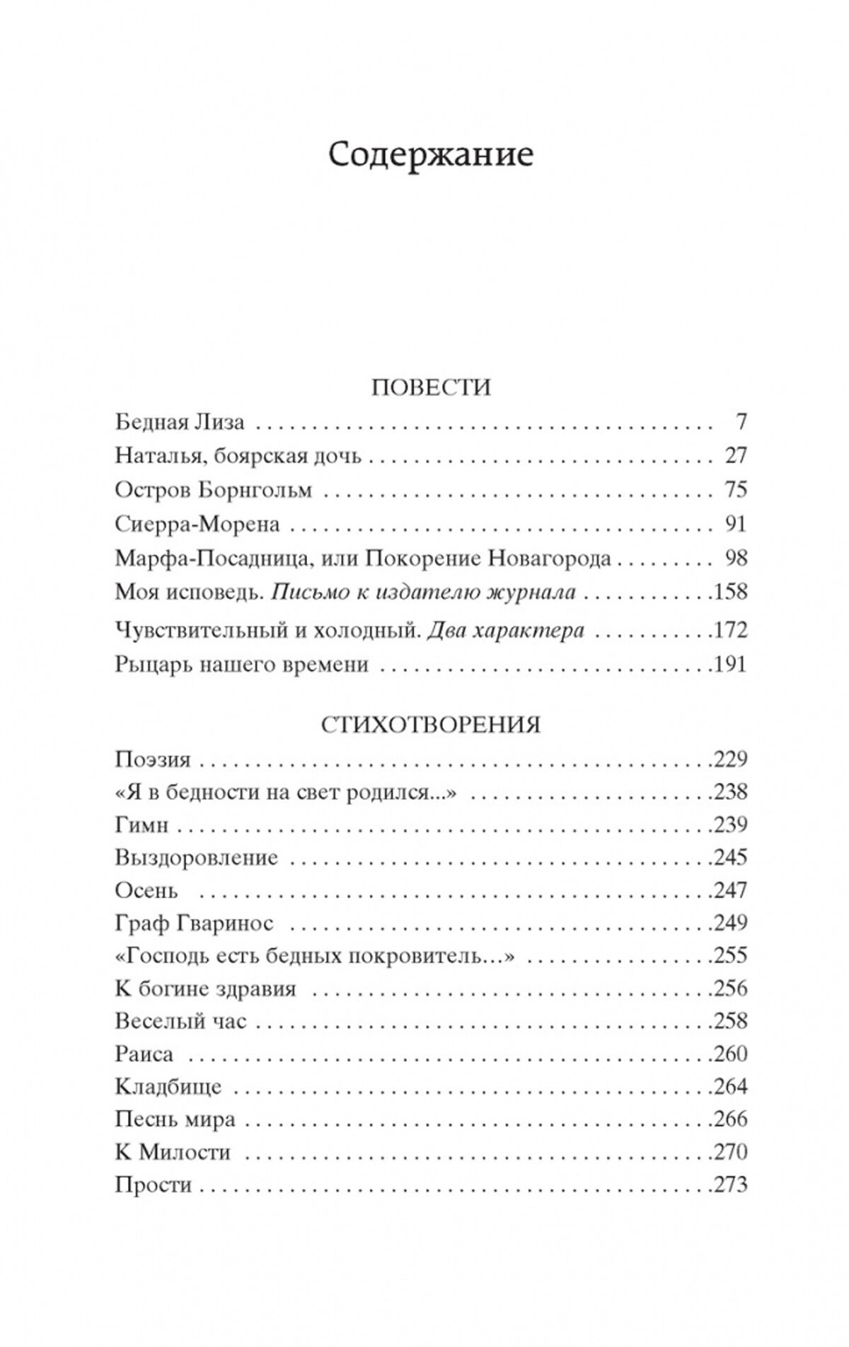 Отличный сборник произведений Николая Карамзина.Давно искала именно такой,понравилось наличие стихов.Оформление прекрасное,с золотым тиснением.Сами произведения лирические,романтические и драматические.Героям сочувствуешь,переживаешь с ними их чувства.\"Бедная Лиза\"-это первое произведение ,которое я читала еще в школе.Рекомендую всем.