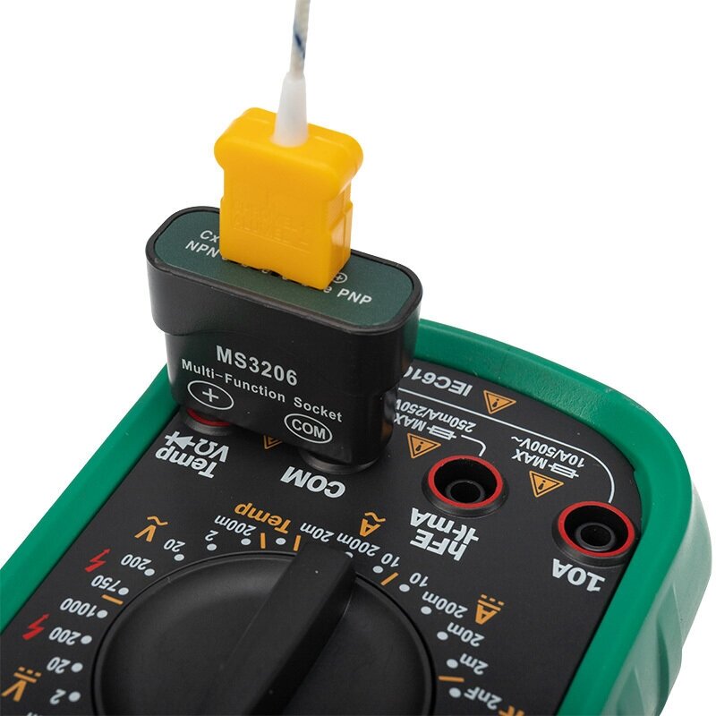 Цифровой мультиметр Mastech измеряет величины силы постоянного и переменного тока, постоянного и переменного напряжения, сопротивления, коэффициента усиления биполярных транзисторов, температуры и ёмкости конденсаторов. Высокое входное сопротивление не вносит погрешности при измерениях величин и говорит о высокой точности прибора. Выбор пределов измерения величин производится вручную путем установки нужного положения многопозиционного переключателя.