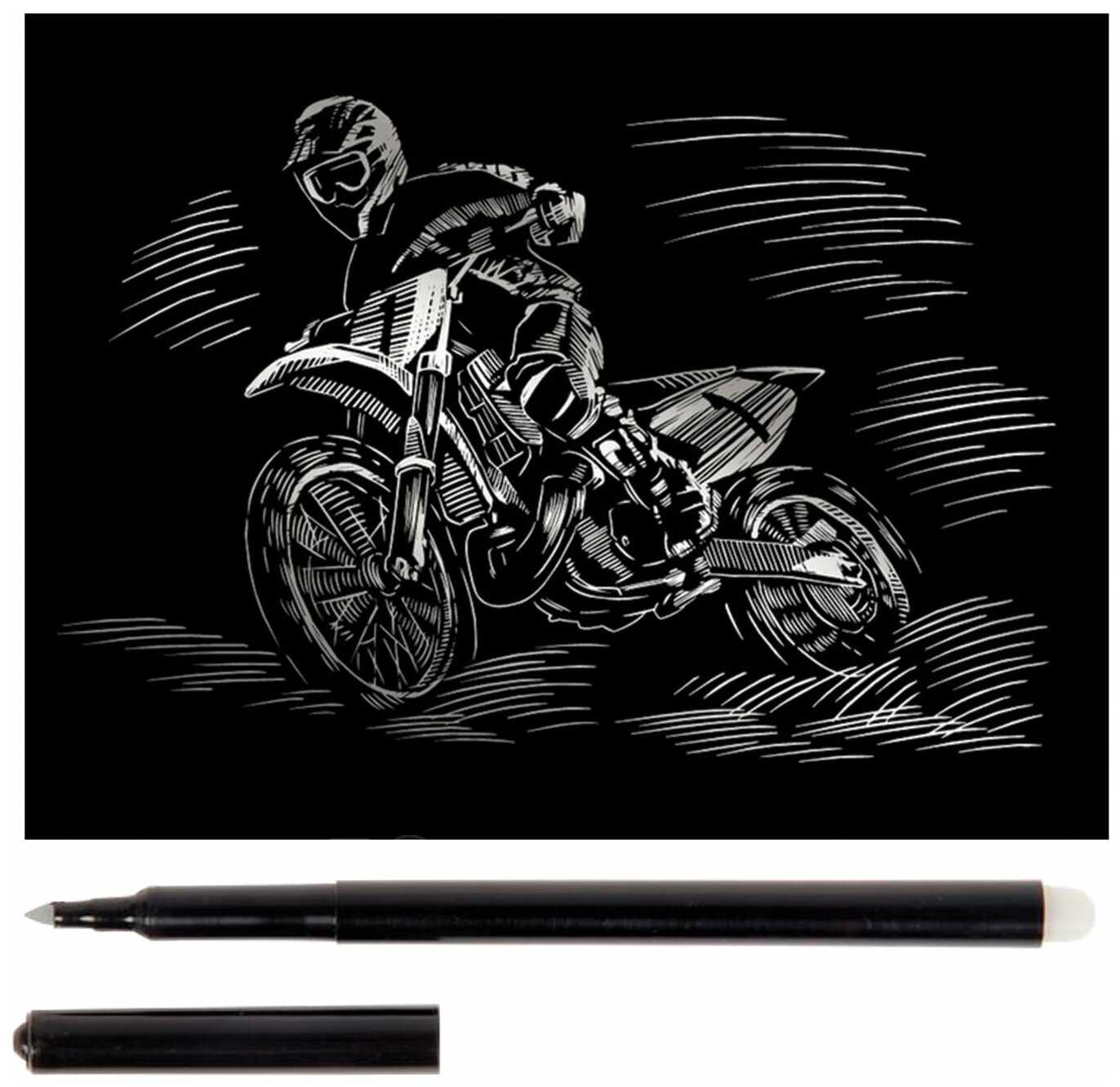 Гравюра с изображением мотоциклиста от компании Лори. Специальный штихель для снятия верхнего слоя идет в комплекте. Во время творческой работы развивается аккуратность и усидчивость. Для детей старше 6 лет.