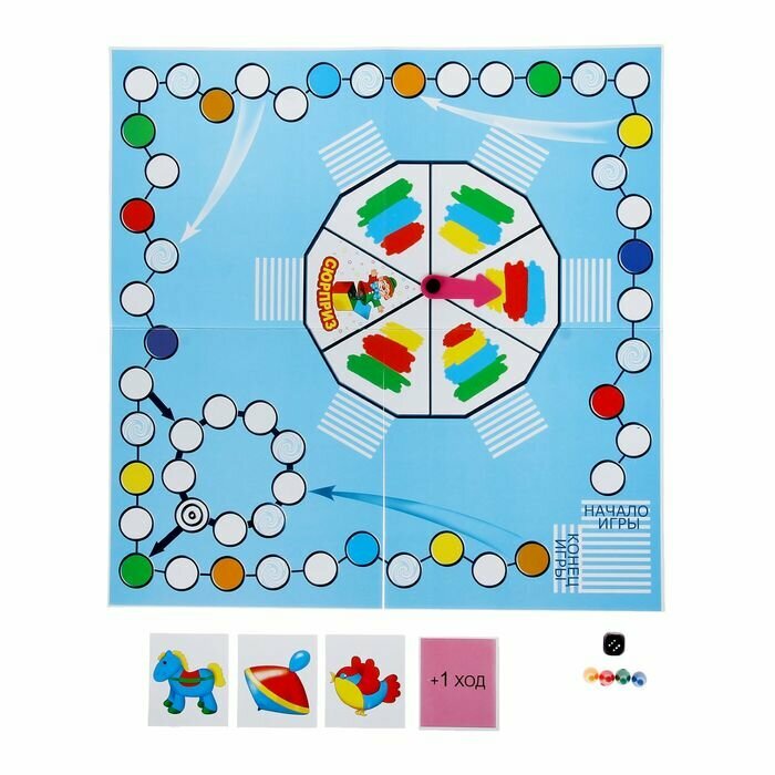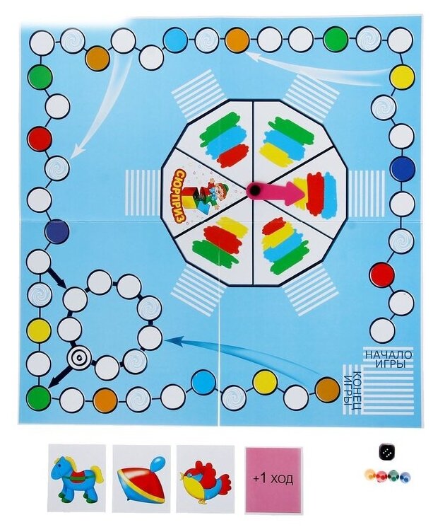 | Состав набора | поле, карты - 35 шт., стрелка, кнопка, блочка, кубик, фишки - 4 шт., правила |