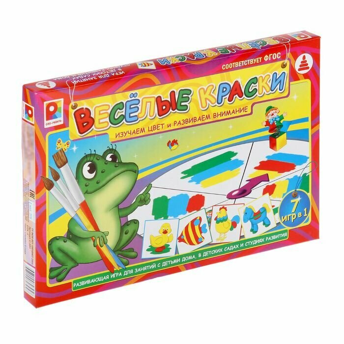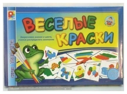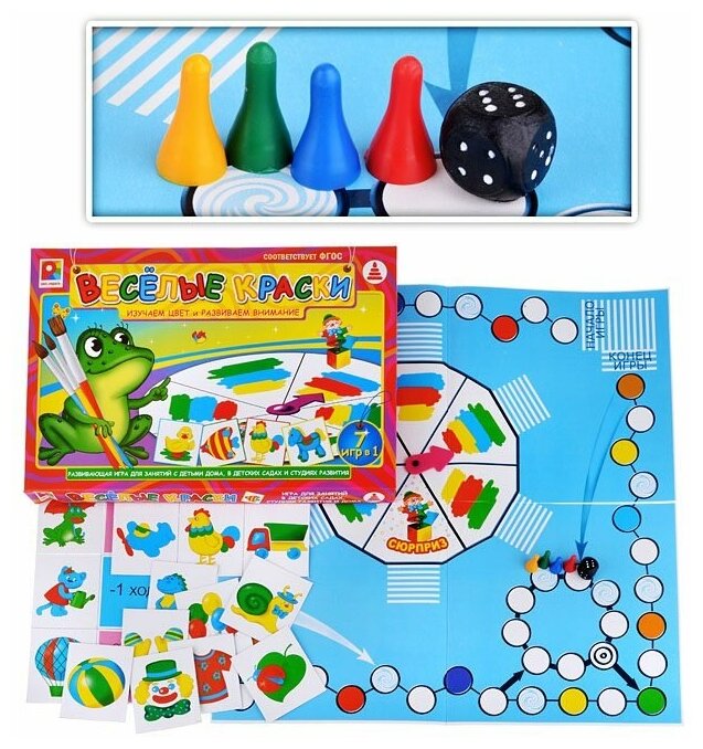 Интересная многовариантная игра Весёлые краски закрепляет знания детей о цвете, совершенствует логическое мышление. Вращая стрелку на центральном поле и подбирая нужные карточки, а также передвигаясь фишками по большому полю, дети учатся распределять внимание, развивают зрительную память.