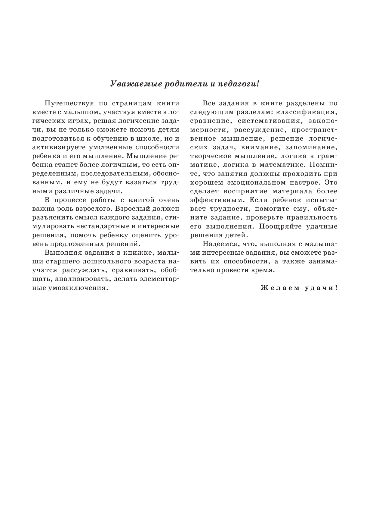 В возрасте 3-7 лет дети активно усваивают новую информацию, часто задают вопросы, стремятся к новым знаниям, формируют собственную картину мира. На первый план выдвигается интенсивная мыслительная деятельность, залог будущего интеллектуального потенциала ребенка. Это время наиболее продуктивно для занятий с малышами, познающими мир. Предлагаемая книга посвящена не только подготовке детей к успешному обучению и восприятию школьной программы, но и развитию самостоятельного мышления, умению систематизировать и обрабатывать информацию, выявлять логические связи и противоречия, делать и обосновывать вывод, формировать собственную точку зрения и отстаивать ее. Она поможет раскрыть творческие способности ребенка, полнее раскрыть его потенциал, дать положительную мотивацию в преддверии школы.
