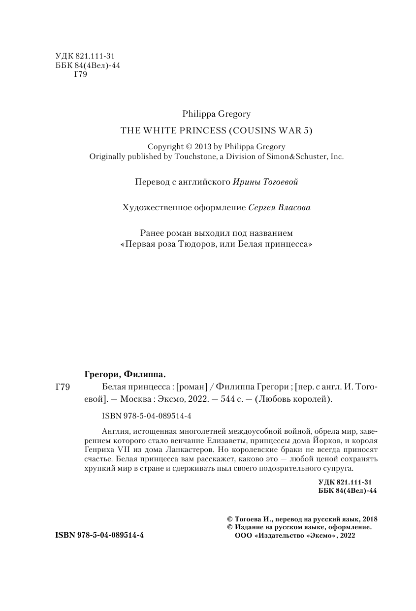 Достойное продолжение "Белой королевы". Филиппа Грегори одна из моих любимых писательниц. Она мастерски переносит читателей в эпоху начала правления династии Тюдоров. Вместе с главной героиней - Елизаветой Йоркской читатель понимает, как тяжело развивалась война кузенов, которая не смогла закончиться даже после династического союзов Йорков и Ланкастеров. Филиппа Грегори показывает читателю, как тяжело быть королём.