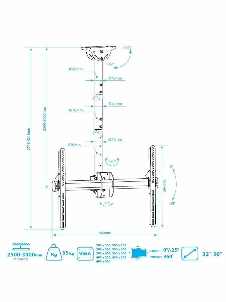 | Описание | Потолочный кронштейн для LCD/LED телевизоров размером от 32 до 90 дюймов с максимальным весом до 55 кг. с возможностью крепления на наклонный потолок. Надежная стальная конструкция. Регулировка наклона 0-25 и углом поворота ±180 градусов. Максимальные крепежные размеры 600х400 мм. |