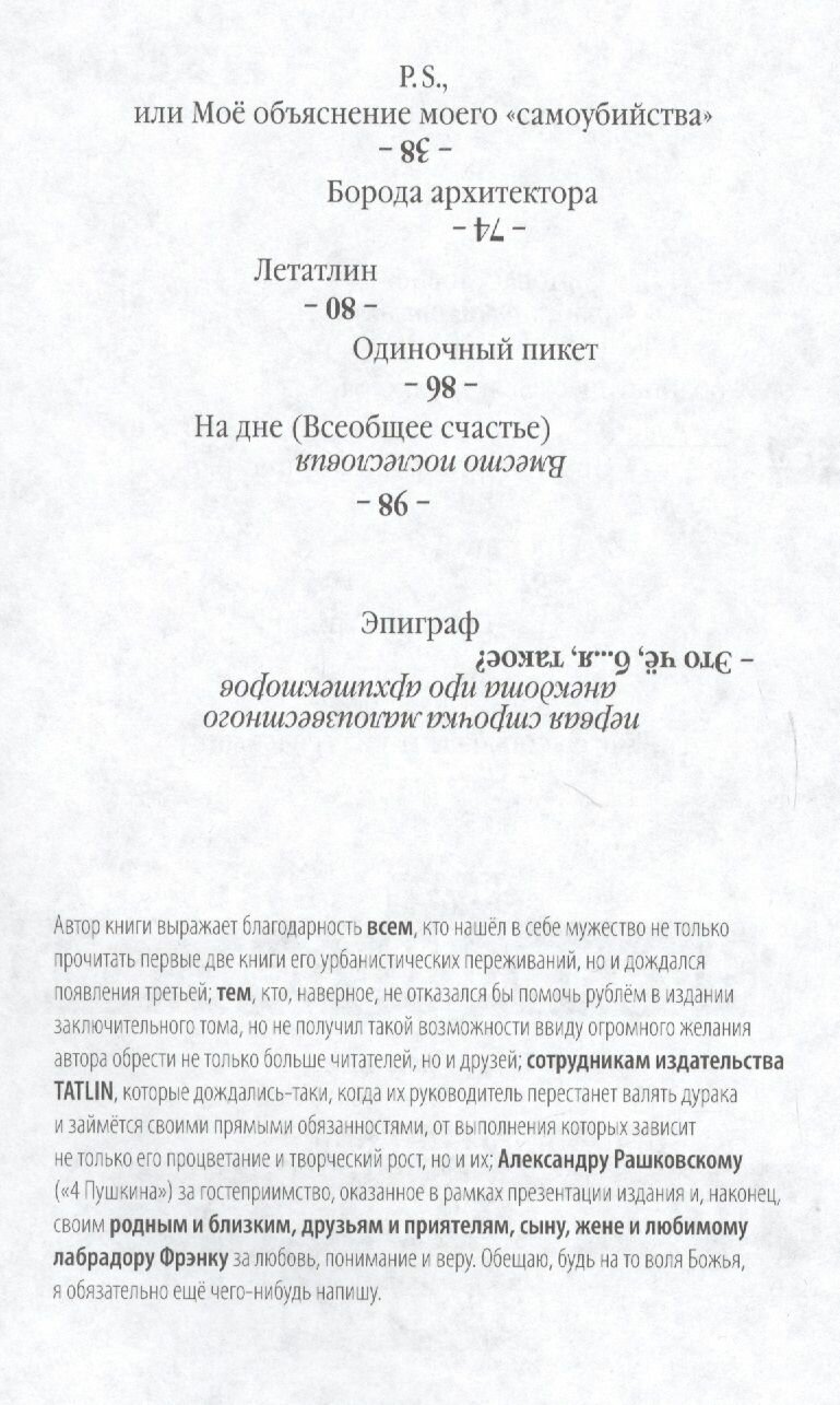 Весь 2016 год архитектор Эдуард Кубенский почти исправно посещал градостроительный совет Екатеринбурга. То же самое он делал почти весь 2015, а в 2014 он даже участвовал в конкурсе на должность главного архитектора Екатеринбурга. Всё это время он то спал, то не спал, то худел, то не худел, то путешествовал, то сидел на месте. Наверное, из-за того, что он метался из стороны в сторону, ни на одном из поприщ так и не сыскал славы, но открыл в себе талант писателя. И понеслось! Сначала он потренировался на родственниках, написав несколько историй из жизни своей семьи, потом на детях, придумав для них пару-тройку сказок, и только после — на архитекторах. Так, с третьего раза он умудрился издать свою первую, добрую книгу, назвав её «Урбанистические сны». Книга была принята широкой аудиторией, и на радостях он написал вторую, но на этот раз уже злую книгу — «Урбанистические бдения». Широкая аудитория отнеслась к ней неоднозначно, и у Эдуарда кроме друзей появились ещё и враги. Несмотря на это, он решил не останавливаться на достигнутом и написал третью книгу «Урбанистические сморы», чтобы не только расставить всё на свои места и назвать всё своими именами, но и окончательно покончить с урбанизмом в отдельно взятом сердце русского архитектора. Простите писателя.
