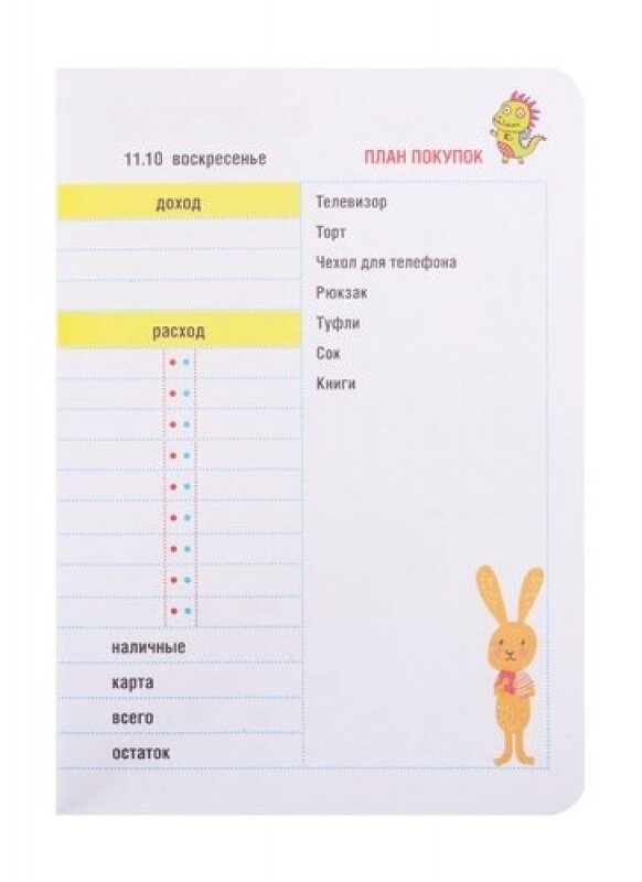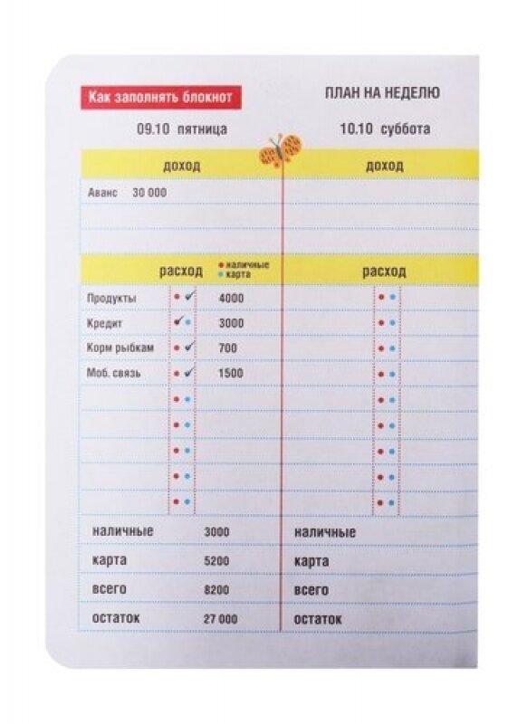 Впервые пользуюсь подобной записной книжкой.Разработка понравилась.Удобно записывать,есть все необходимые графы,разделение на нал и безнал,также можно составить план на месяц,на неделю,список необходимвх покупок.Создается полная картина доходов и расходов.Удобно носить с собой,приятная на ощупь обложка.