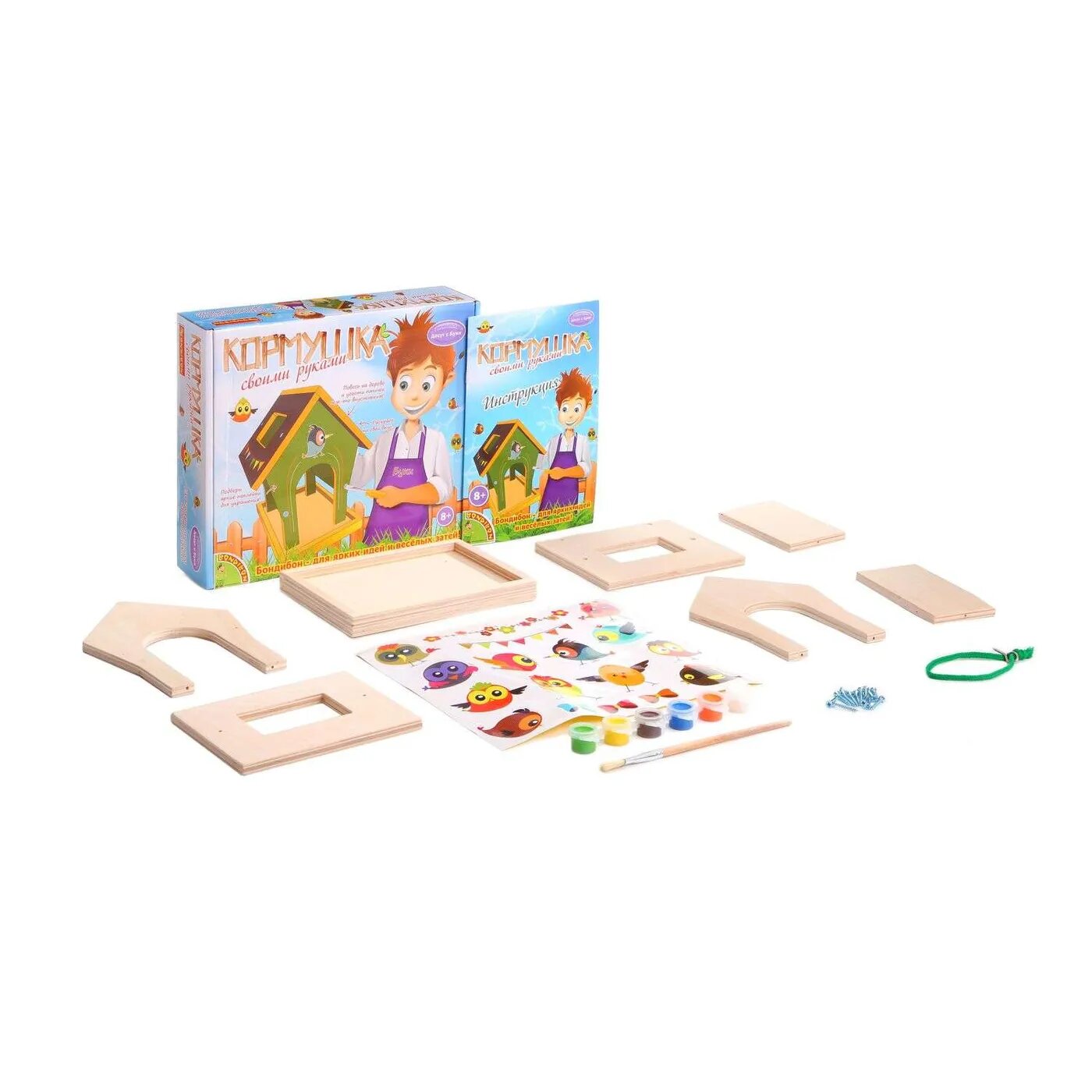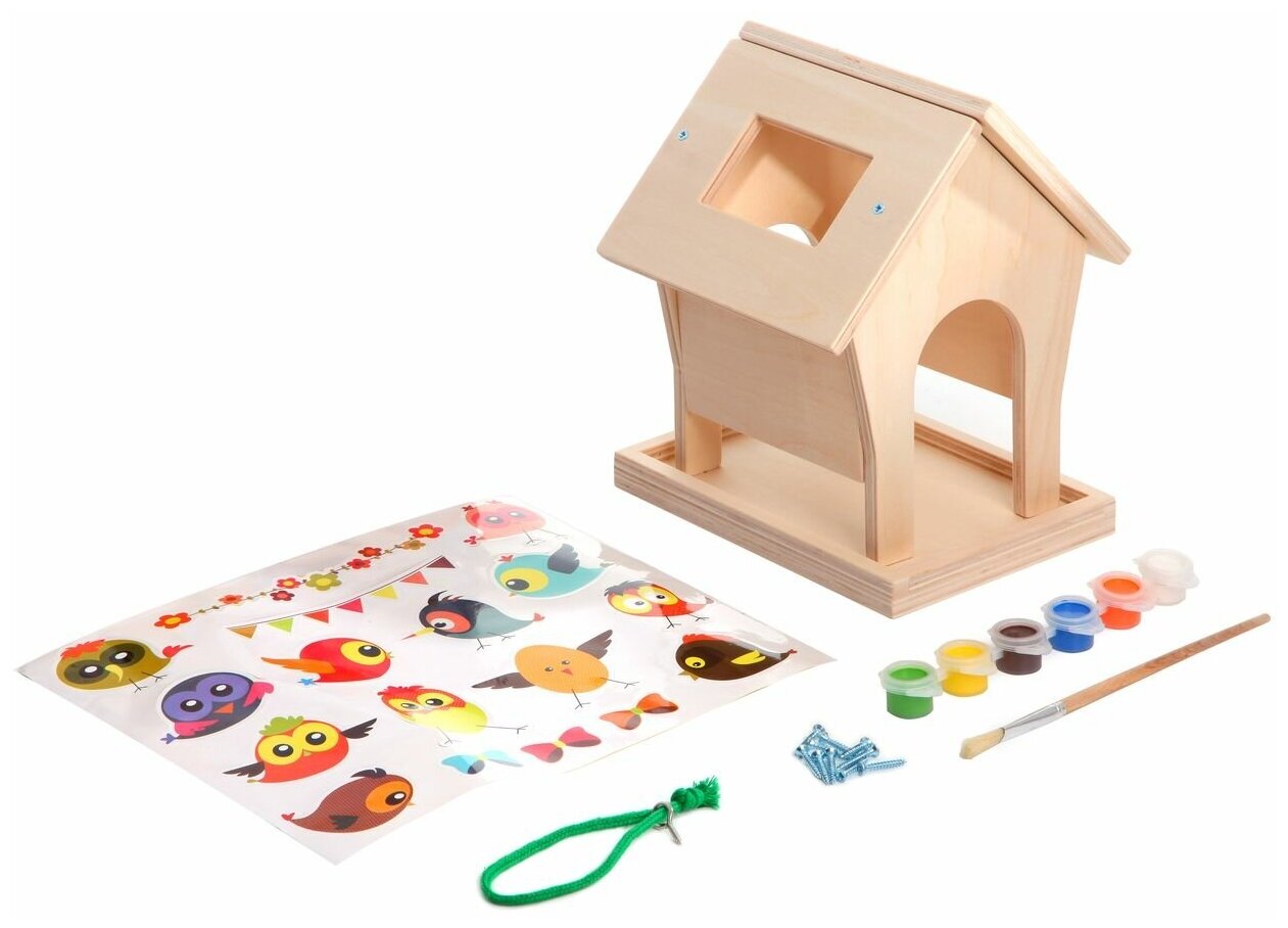 Набор для творчества Моделирование из дерева. Используя этот деревянный набор, вы сможете самостоятельно построить кормушку для птиц! Первоначально следует собрать деревянные заготовки с помощью шурупов и отвертки, входящих в комплект, а подробная инструкция поможет в этом! После сборки наступает самое интересное, ведь ты можешь придать получившейся кормушке свой уникальный, неповторимый дизайн! Мы приготовили интересные и нестандартные цвета красок, а на коробке ты сможешь найти варианты изготовления самых удивительны цветов и оттенков из уже имеющихся. Поскольку краски являются водонепроницаемыми, то кормушка может быть использована в любую погоду, а птички не останутся голодными ни в дождь, ни в самую лютую зиму! Входящие в набор декоративные наклейки помогут сделать кормушку еще ярче и индивидуальнее! Замечательная кормушка для птичек готова, ее можно подвесить с помощью входящих в набор крючка и бечевки!