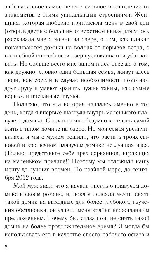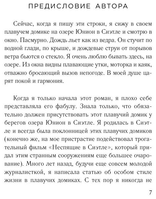 Потрясающая книга. Очень понравилась. Как-будто сама уехала отдыхать в Сиэтл и жила в плавучем домике)) Две главные героини. Переплетается прошлое и настоящее. Две истории любви. Разная концовка этих историй. Есть рецепт булочек с корицей. Еще их не готовила, но дрожжи уже лежат на столе. Очень нравятся книги, которые не только заставляют думать, или отдыхать и наслаждаться, или просто отвлекают от проблем, но и пробуждают к действию. Книга на 5 +. Рекомендую)