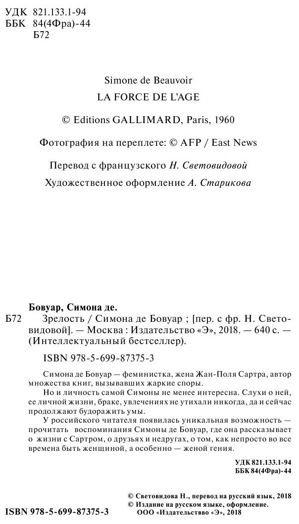 Книга: Зрелость (Бовуар Симона де , Световидова Нина Алексеевна (переводчик)); Эксмо, 2018