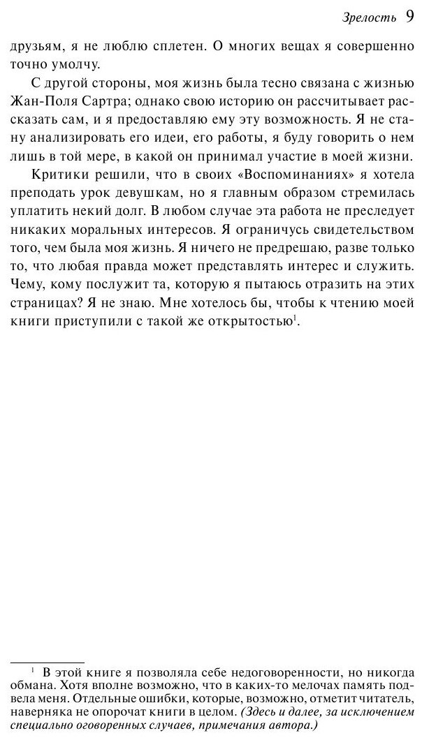 Книга объёмная, главы длинные. Материал подан НЕ в форме дневника, просто воспоминания в хронологическом порядке. Местами читать непросто, но интересно. Симона рассказывает как реагировала общественность на её поведение, на гражданский брак с Сартром. В книге дух времени первой половины 20 века (Симона начинает воспоминания с 1929 года, после того как закончила университет и стала жить самостоятельно). Местами книга очень откровенная.