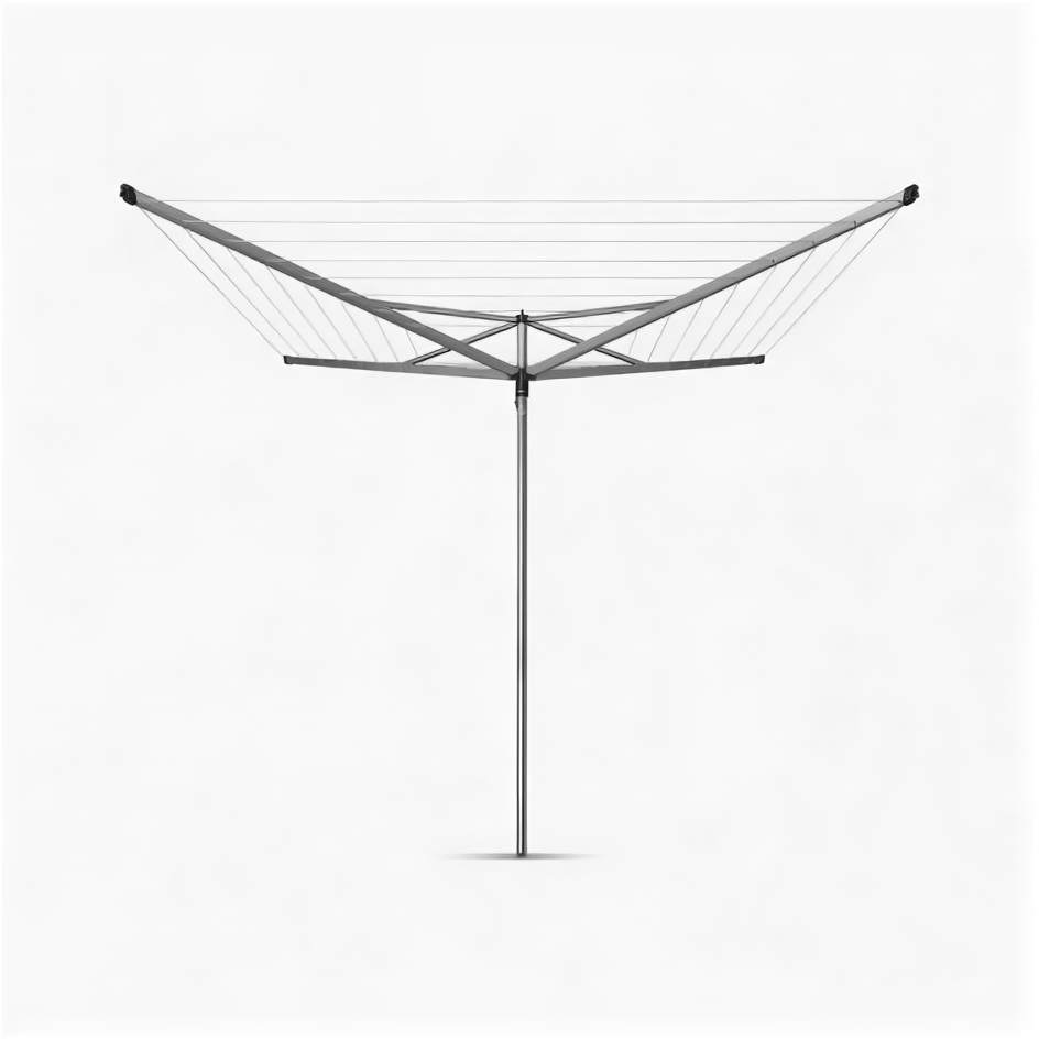 Сушилка для белья уличная для установки в грунт Essential Brabantia: - Максимальная нагрузка – 40 кг. - Простой и удобный регулируемый «зонтичный» механизм сложения. - Всегда туго натянутые веревки – регулировка натяжения в двух положениях. - Бельевые веревки устойчивы к действию УФ и имеют нескользящий профиль. - При необходимости удобная замена каждой веревки по отдельности. - На всех направляющих предусмотрены специальные отверстия для плечиков. - Удобна в хранении – прочная петелька для подвешивания.