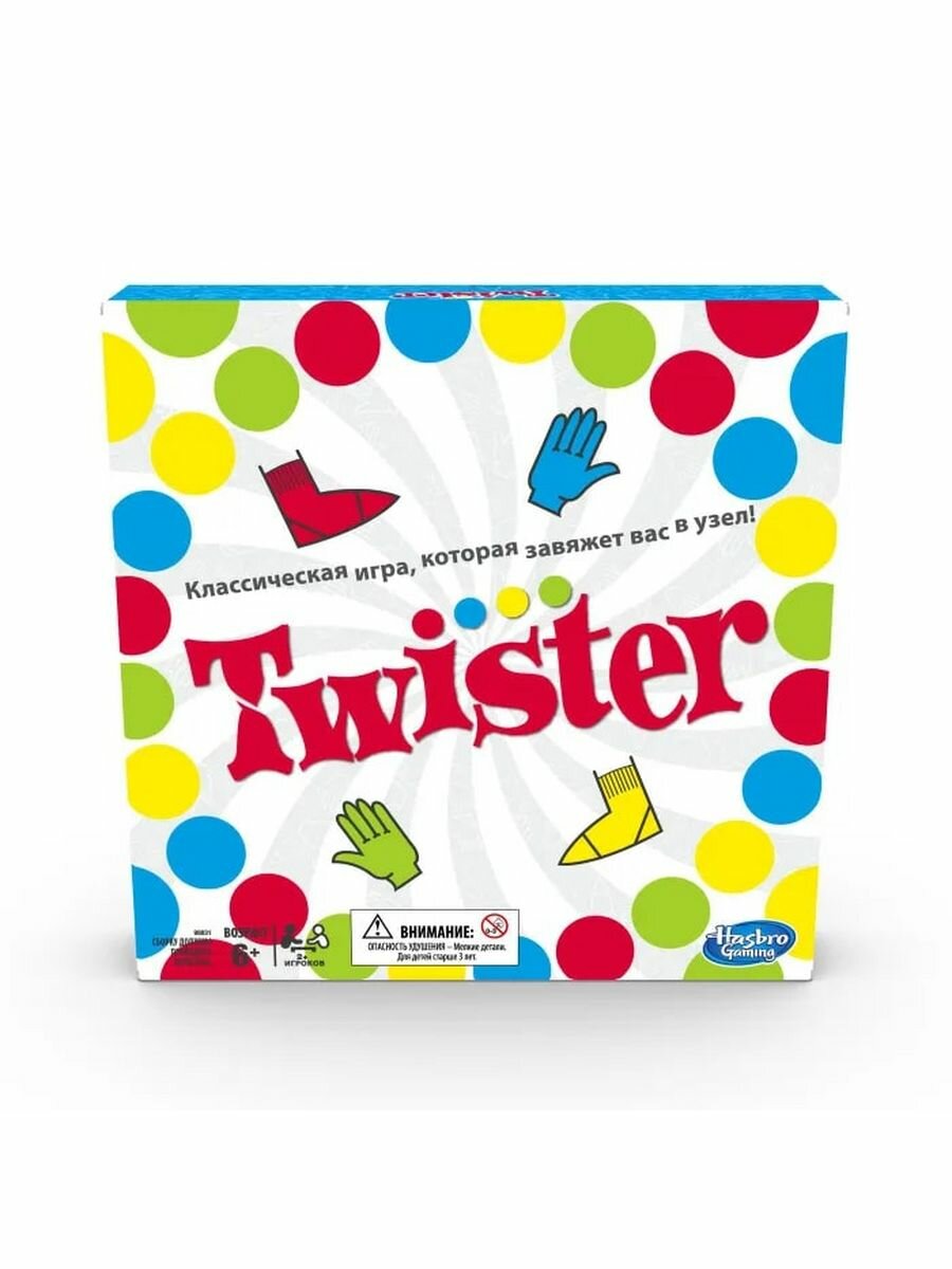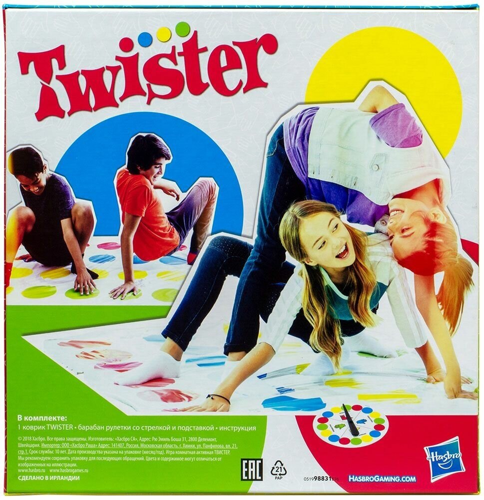 Настольная игра Hasbro 98831 Твистер станет отличным развлечением для детей, семейной пары или веселой компании на вечеринке. Участники по очереди крутят рулетку, которая указывает, на какой круг им следует ставить ладони или ступни. Побеждает тот, кто последним удержится на поле и выполнит все указания. Игра позволяет продемонстрировать свои физические способности. Она развивает координацию движений, а также повышает гибкость мышц и суставов.