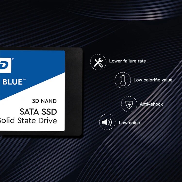 Твердотельный накопитель WD Blue отличается высоким быстродействием, оптимизирует хранение данных и обеспечивает высокую скорость передачи наряду с ведущей в отрасли надежностью.Подходящий формфактор для вашего ПК. Твердотельные накопители WD Blue доступны в формфакторах 2,5 дюйма (7 мм) и M.2 2280 для самых тонких и компактных компьютеров, что позволяет комплектовать ими большинство ноутбуков и настольных ПК. Доступная для скачивания панель мониторинга твердотельных накопителей WD содержит набор инструментов, с помощью которых можно в любой момент проверить работоспособность твердотельного накопителя. Сертификация WD F.I.T. Lab. Сертификация WD F.I.T. Lab на совместимость с широким спектром ноутбуков и настольных ПК служит подтверждением, что накопитель WD Blue вам подходит. Бесплатная панель мониторинга SSD-накопителей WD. Доступная для скачивания панель мониторинга SSD-накопителей WD предоставляет набор инструментов, с помощью которых можно в любой момент проверить доступную емкость, работоспособность, температуру, атрибуты SMART и другие параметры своего твердотельного накопителя. Ограниченная трехлетняя гарантия. На каждый твердотельный накопитель WD Blue предоставляется 3-летняя ограниченная гарантия, которая застрахует ваш накопитель WD при хранении любых данных.