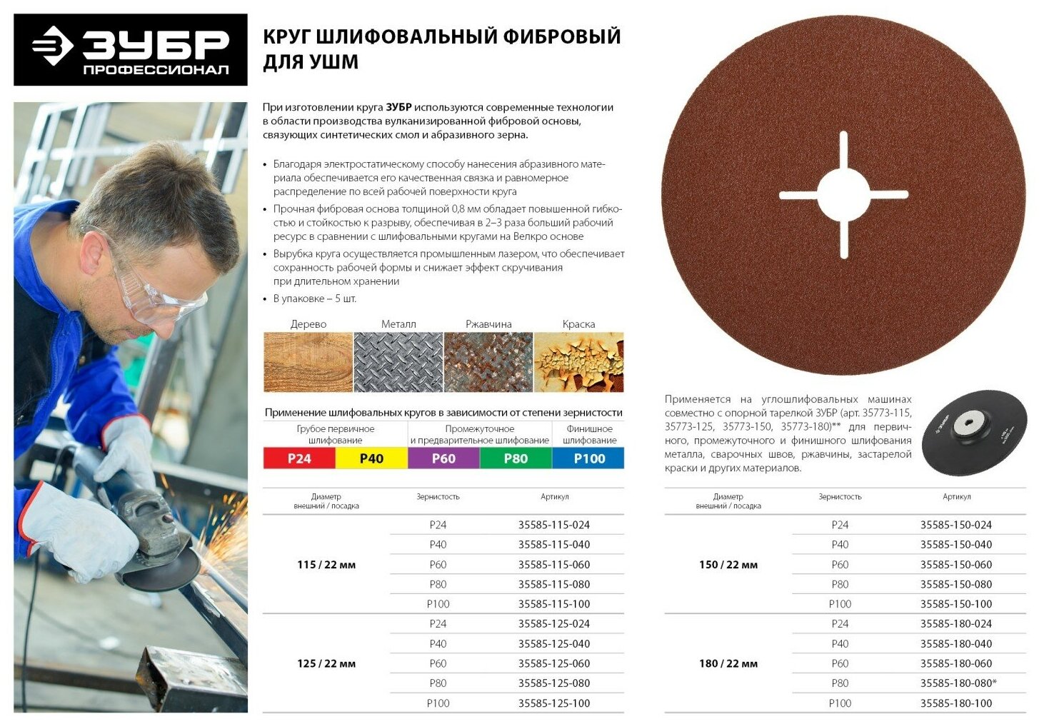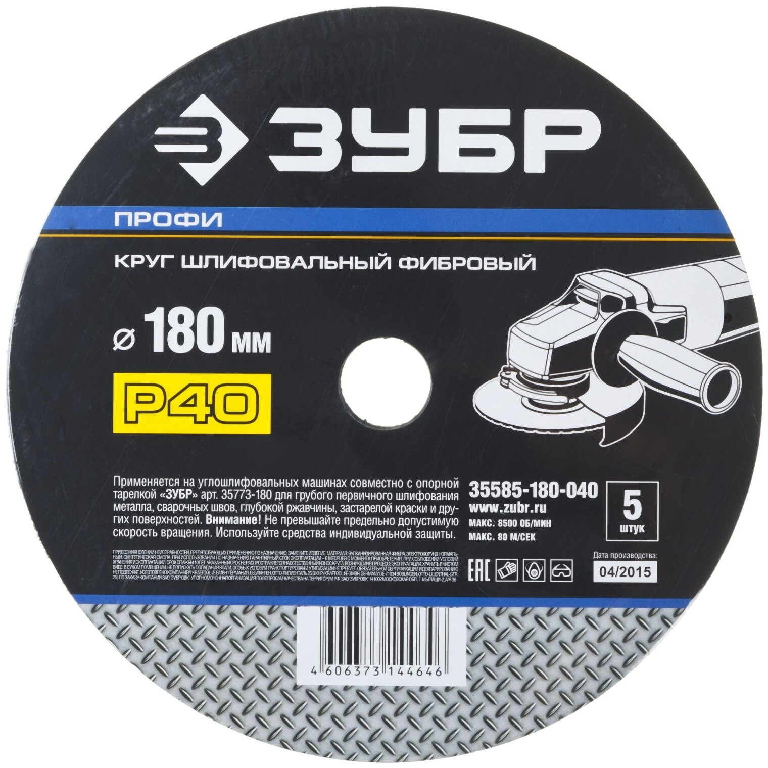 ЗУБР P40, 180х22мм, 5 листов, круг шлифовальный фибровый, для УШМ Профессионал ()Модель - Технические характеристики:-Метод нанесения абразива: Электростатический -Толщина фибровой основы: 0,8мм -Рабочий диаметр: 180 мм-Зернистость: Р40 -Метод вырубки круга: Резка промышленным лазером -Тип фиксирующего отверстия: КрестообразноеНеоспоримыми преимуществами шлифовальных инструментов ЗУБР являются их высокая производительность, увеличенный рабочий ресурс и универсальность при обработке дерева, металла и других материалов. При изготовлении этого круга используются современные технологии в области производства вулканизированной фибровой основы, связующих синтетических смол и абразивного зерна.Преимущества:Благодаря электростатическому способу нанесения абразивного материала обеспечивается его качественная связка и равномерное распределение по всей рабочей поверхности круга;Прочная фибровая основа обладает повышенной гибкостью и стойкостью к разрыву.