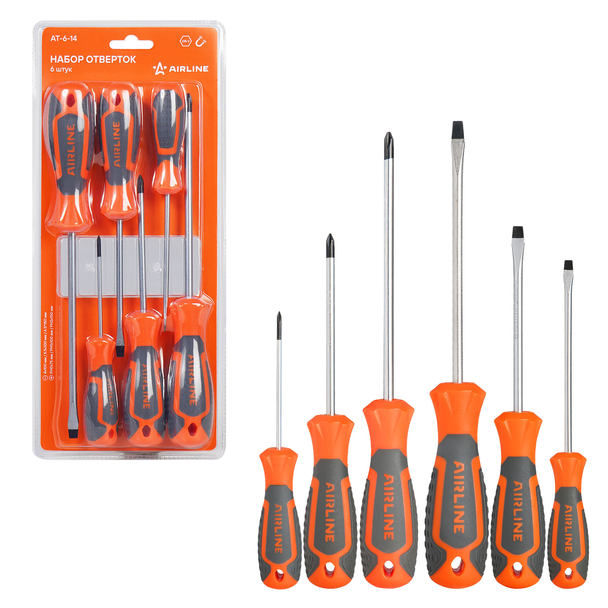 Комплект отверток "Airline" состоит из 6 моделей инструментов с различным диаметром рабочей поверхности. Изделия имеют двухкомпонентные эргономичные рукоятки. Сочетание твердых и мягких элементов рукоятки оптимально распределяет усилие, прилагаемое к инструменту, и предотвращает проскальзывание. Эргономичный дизайн облегчает работу. Отвертки удобно подвешиваются за специальное отверстие. Лезвие отверток изготовлено из хром-ванадиевой стали, жало подвержено индукционной закалке и фосфатировано.
