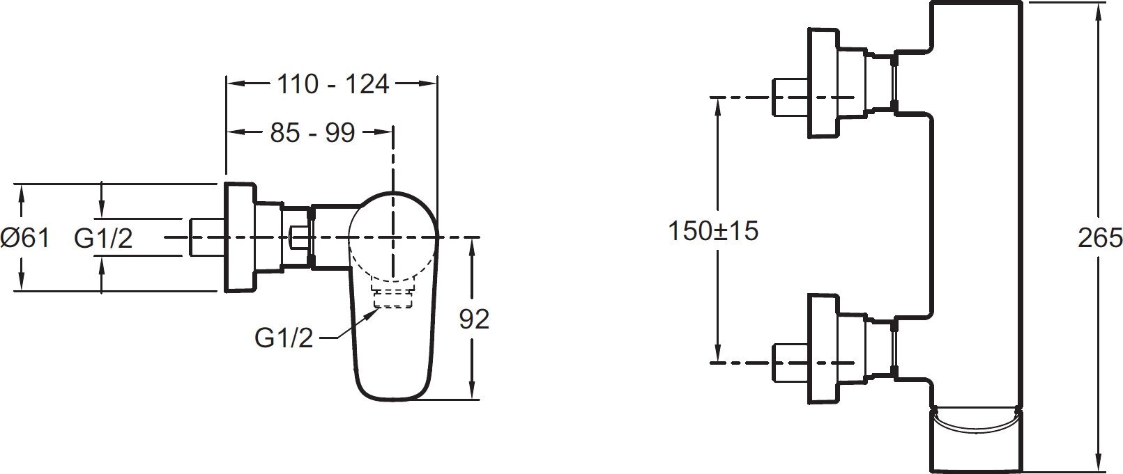 Однорычажный настенный смеситель для душа. Механизм: керамический картридж. Крепежи: с соединителями и настенными крепежами. Расход : 14 л/мин