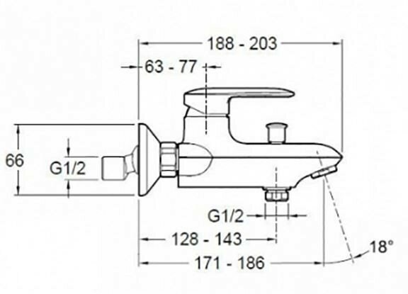 Однорычажный настенный смеситель для ванны/душа. Керамические кран-буксы. Автоматическая кнопка-переключатель. Встроенный аэратор с антиизвестковым покрытием. Расход воды: 20 Л/мин.