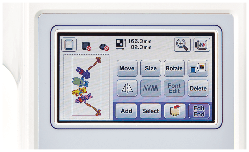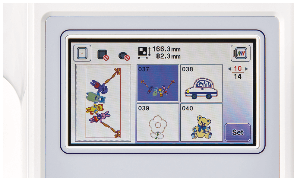 | Дополнительная информация | предпросмотр дизайна для вышивания, зеркальное отображение дизайна, выбор размера вышивального шрифта (L-M-S), ввод многострочного текста, возможность шитья без педали |