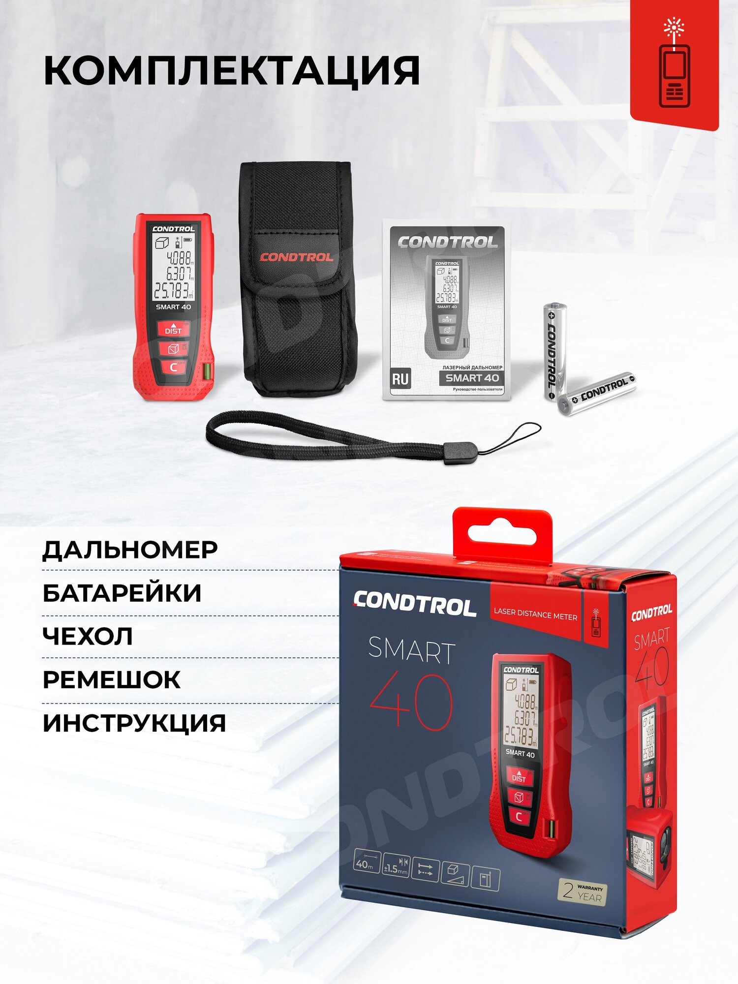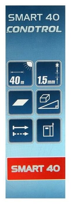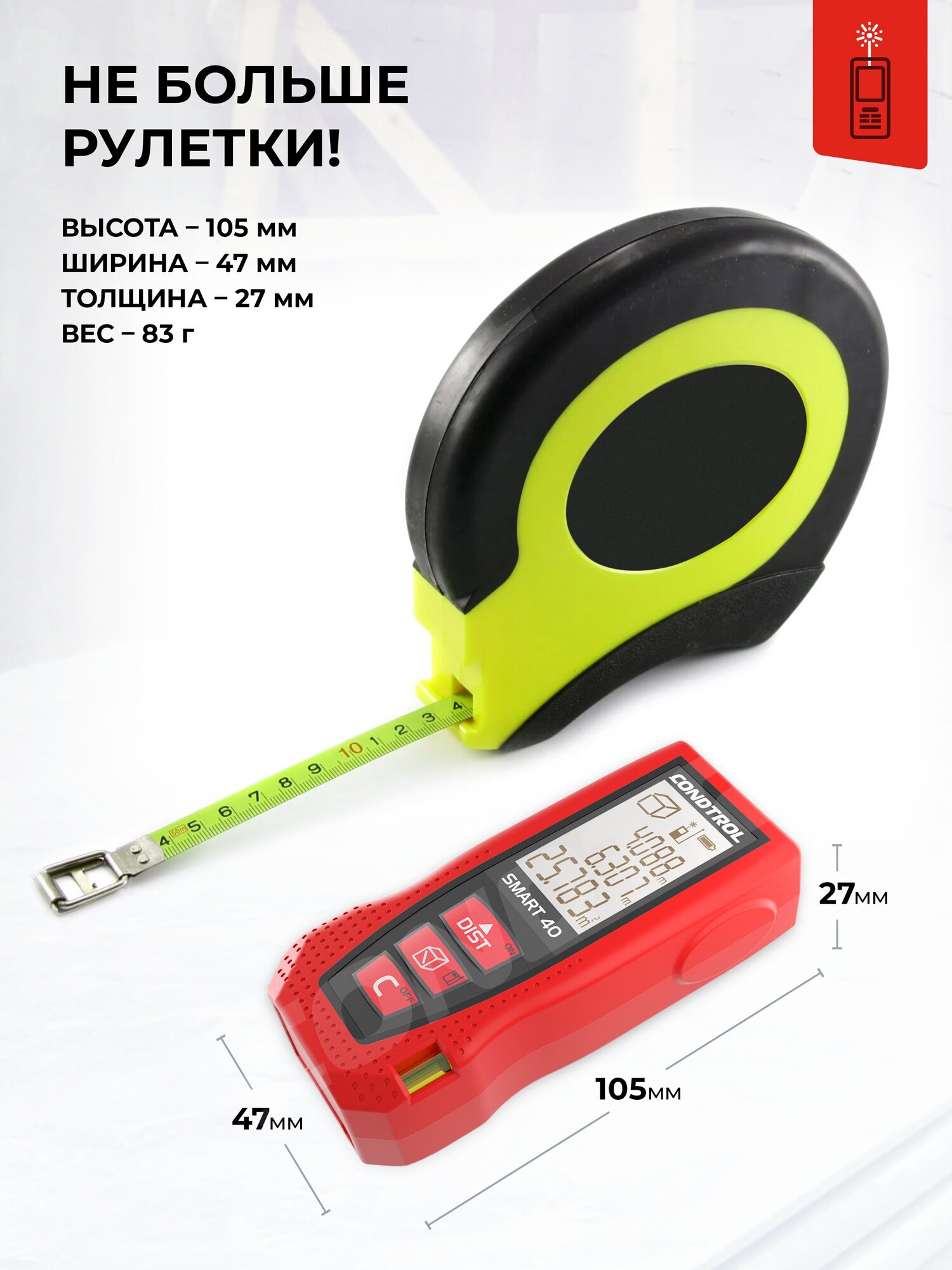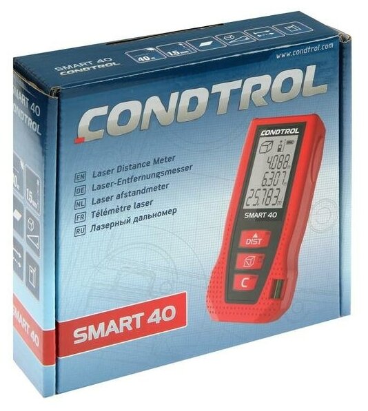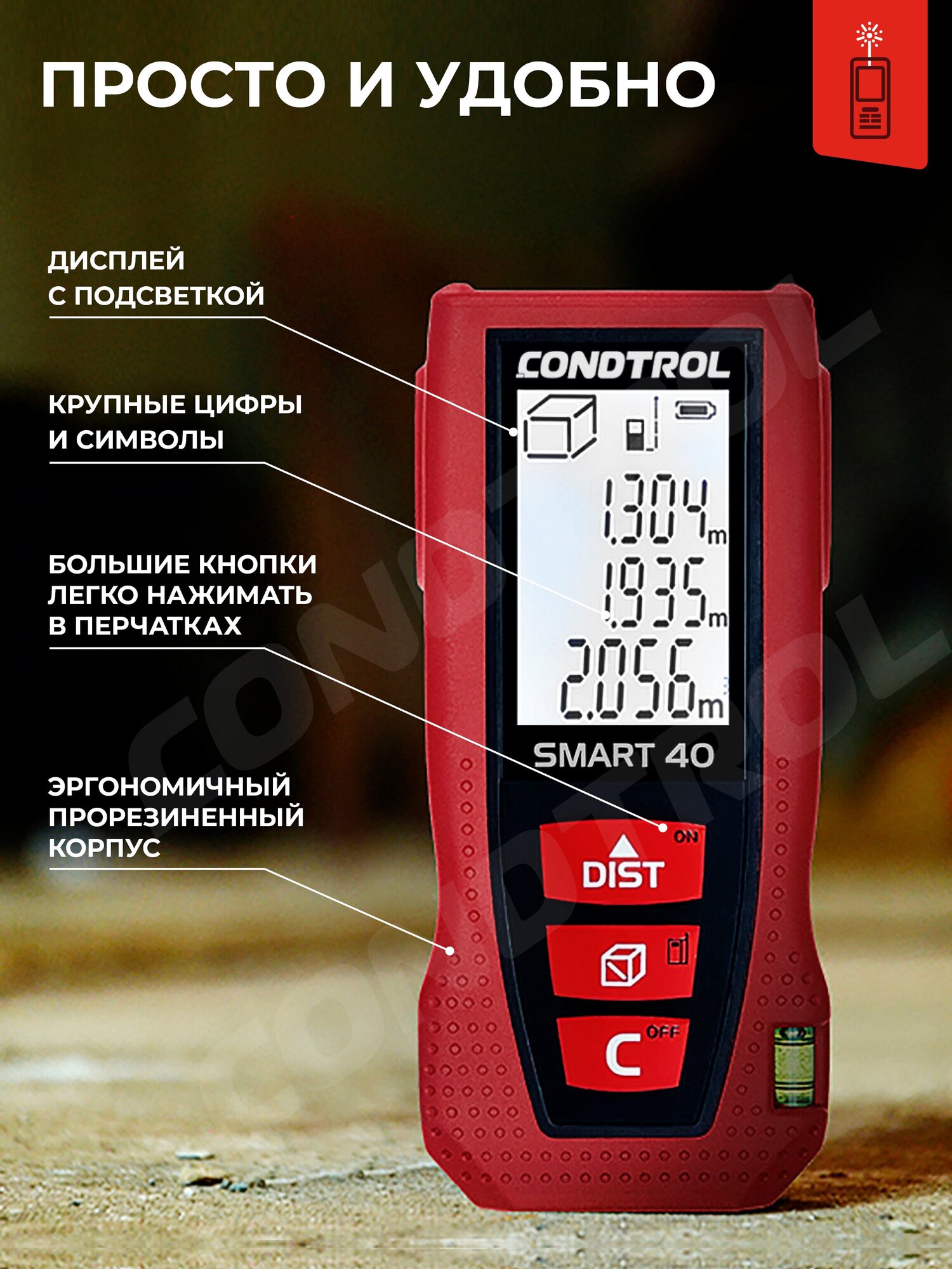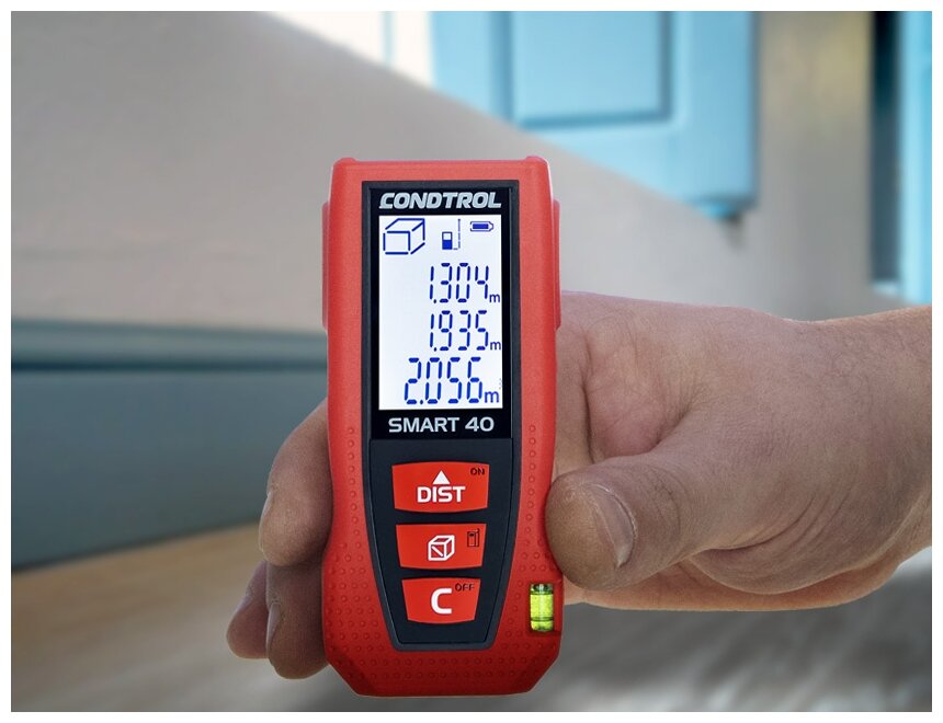 CONDTROL – лазерная рулетка, обладающая ударопрочным корпусом и оптикой нового поколения, благодаря которой можно работать в любых условиях освещения. Дальномер позволяет проводить замеры как на улице, так и в помещениях на расстоянии до 40 м.