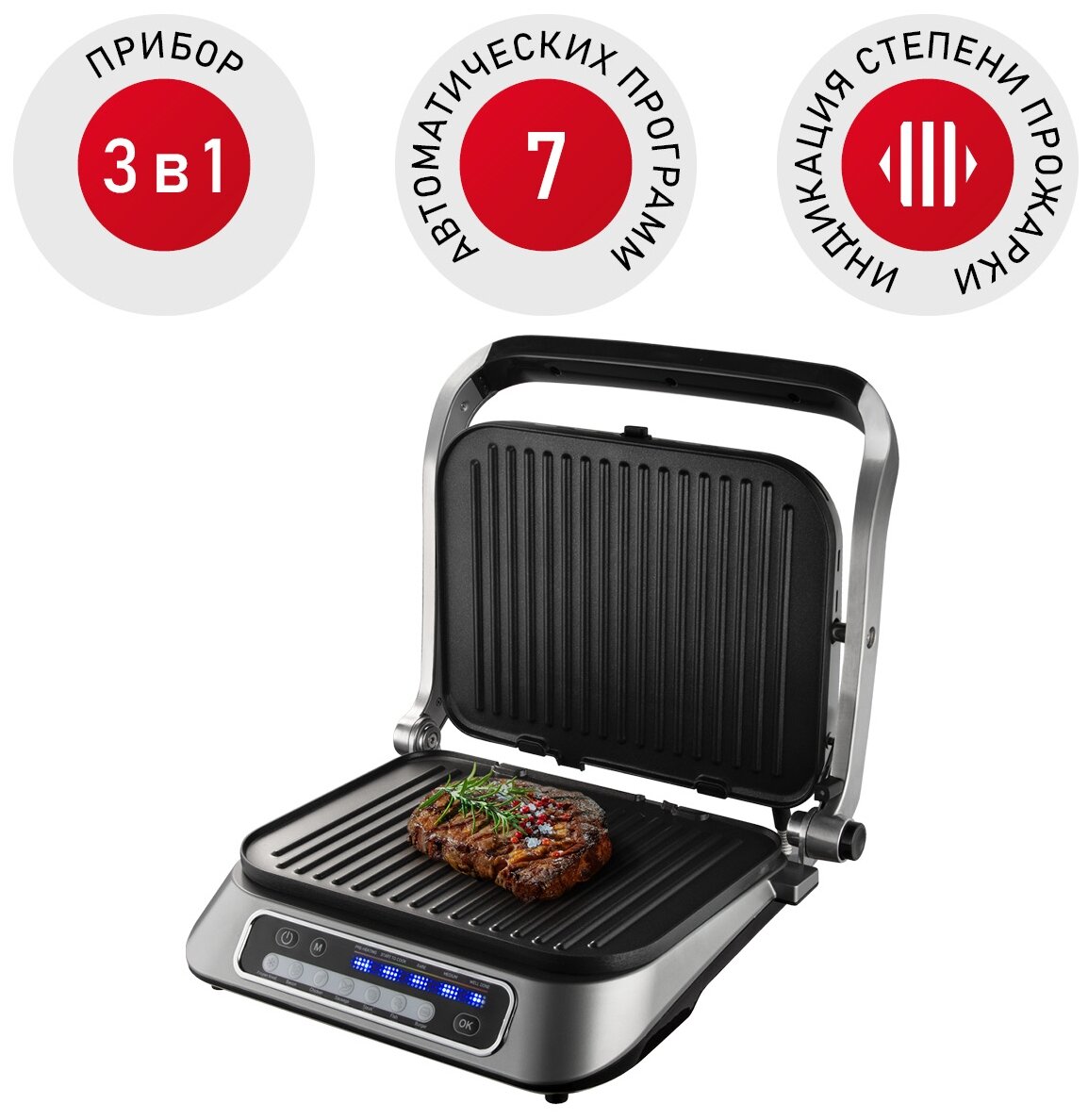 | Список режимов/программ приготовления | 7 автоматических программ. Положите продукты в гриль и выберите программу. Встроенный магнитный датчик определит толщину стейка, подберет подходящее время приготовления, разморозки, разогрева. Благодаря световым индикаторам вы узнаете степень прожарки стейков. |