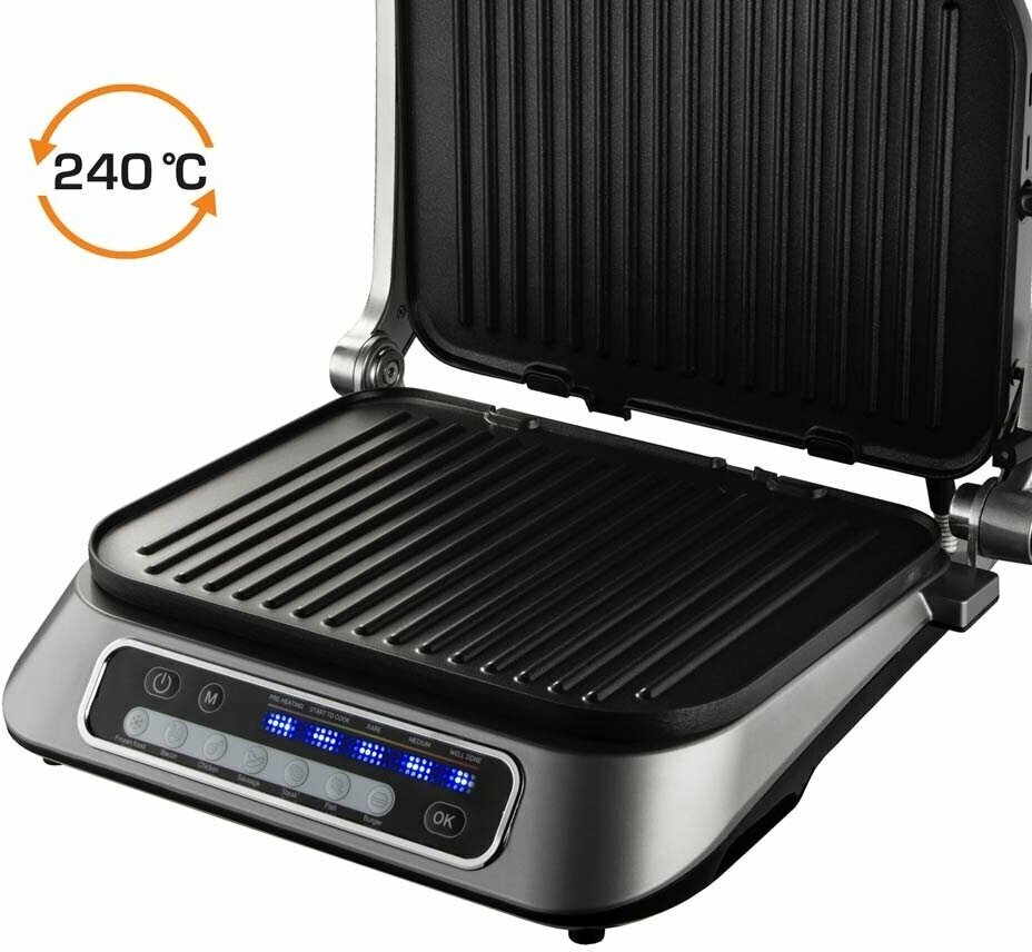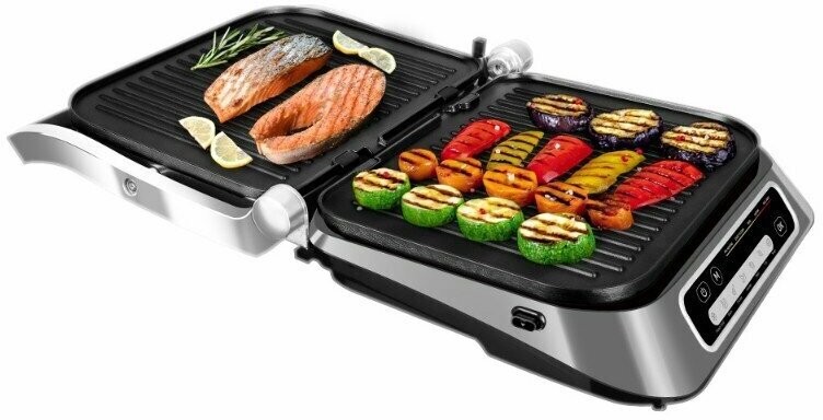 | Дополнительная информация | открытие на 180°; съемные панели, можно мыть в посудомоечной машине; нагревательные элементы встроены в панели; автоматическое определение времени приготовления;автоматическое определение толщины закладываемого продукта; 7 автоматических программ разморозка/разогрев, бекон, птица, сосиски, мясо, рыба, котлеты и бургеры; ручной режим; индикация степени прожарки |