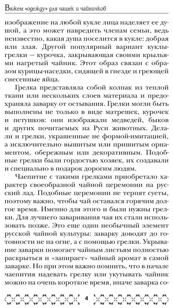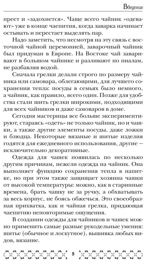 С недавних пор всё большую популярность приобретают "грелки" для чайников, чашек и кружек, которые служат интересным способом украшения предметов быта. В создании "одёжки" для посуды хозяйки могут применить самые разнообразные виды рукоделия: шитьё, вышивка, вязание крючком и спицами.