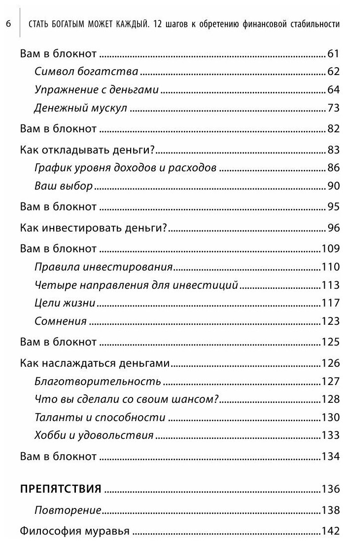 Очень необычная и интересная книга на подобную тему стала настоящим сюрпризом. Автор не столько учит и дает советы как стать богатым, сколько дает возможность самим получить ответы на волнующие вопросы о желаемом финансовом благополучии, на собственном опыте. Все написано понятным языком, порадовали философские притчи и структурированный текст. И хоть те шаги финансовой стабильности, что описывает автор не новы, но преподнесены они четко и логично, не вызывая отторжения и усмешки. Поэтому очень даже рекомендую