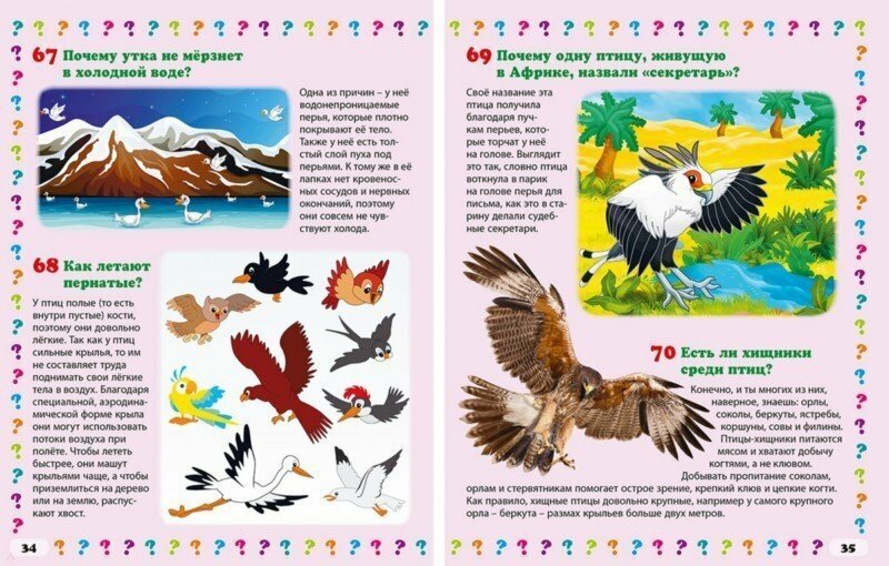 Для самых-самых маленьких это очень классная энциклопедия: по оформлению она прям очень детская. Везде всё цветное и яркое: по периметру разворота идет ряд цветных вопрос, к каждому вопросу есть своя цветная иллюстрация. К тому же большинство иллюстраций – улыбающиеся добрые животные. Но несмотря на это, вопросы, которые рассматриваются в энциклопедии, интересные и занимательные. А сама постановка вопроса так вообще может поставить самих родителей в тупик. Например, почему фламинго розовые или как летают птицы? Изложение материала, то есть ответы на вопросы, написаны достаточно просто, но и не через-чур по-детски. Сам ответ достаточно краткий, без углублений, но общее представление понять можно. К тому же к каждому ответу есть своя иллюстрация. В среднем на одном развороте представлено 4 ответа на 4 вопроса, всего в энциклопедии 130 ответов.