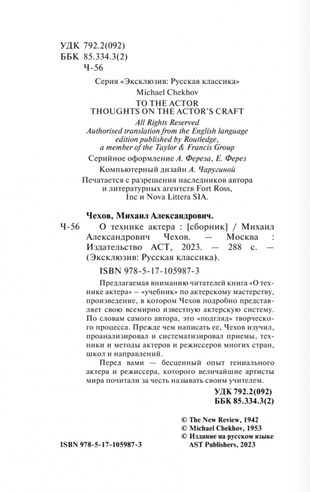 Предлагаемая вниманию читателей книга "О технике актера" - "учебник" по актерскому мастерству, произведение, в котором Чехов подробно представляет свою всемирно известную актерскую систему. По словам самого автора, это "подгляд" творческого процесса. Прежде чем написать ее, Чехов изучил, проанализировал и систематизировал приемы, техники и методы актеров и режиссеров многих стран, школ и направлений.