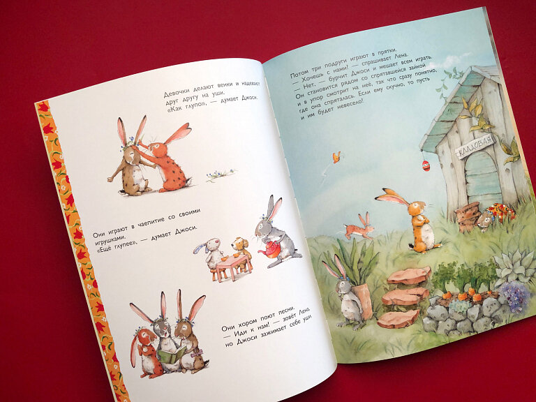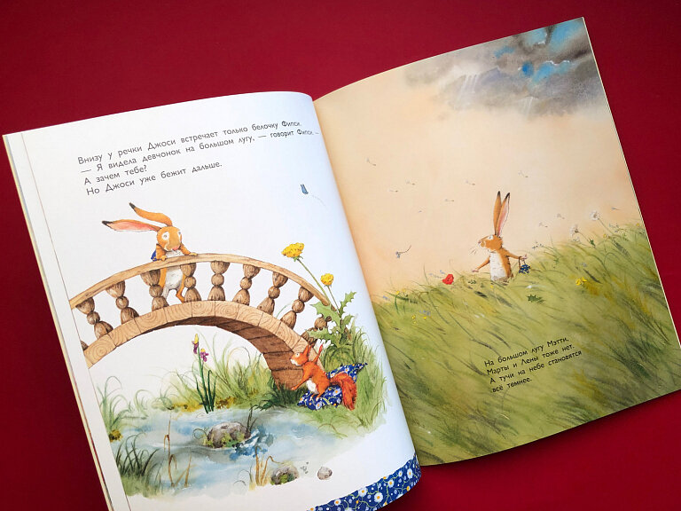 Чудесные нежные иллюстрации,одно удовольствие от обладание такой книги!Добрая история о зайчике Джоси,который не смотря на то что поссорился с сестренками,бежит их искать перед грозой.Забыв о обиде,и преодолев страх,спас сестренок!Очень любим эту книгу и есть еще одна этого же автора! "А дома лучше!" ссылка ниже.