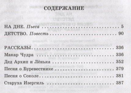 В сборник вошли произведения Алексея Максимовича Горького (1868 - 1936, настоящая фамилия - Пешков), изучение которых входит в обязательную школьную программу: пьеса "На дне", повесть "Детство", стихотворения "Песня о Буревестнике" и "Песня о Соколе", рассказы "Макар Чудра" и "Старуха Изергиль".