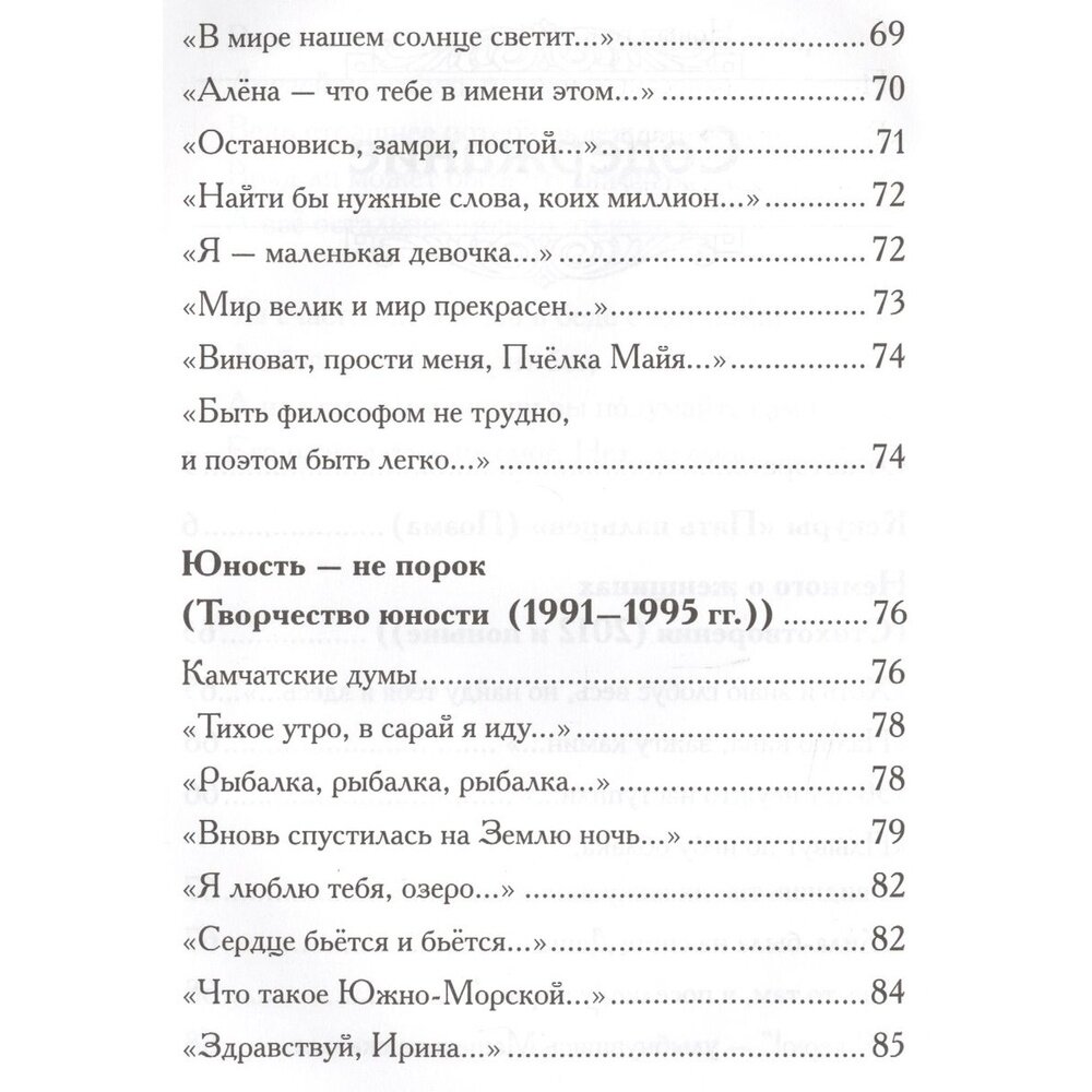 Сборник стихов автор адресует всем любителям и ценителям поэзии. В него вошли ранние стихи, еще не совсем совершенные, но несущие в себе фантазии и задор юности, переживания и поиски любимой, сомнения, восторги и разочарования. В начале книги дано уже более зрелое произведение - поэма "Кекуры "Пять пальцев"" - это эпическое произведение, пропитанное любовью к Приморскому краю, повествующее о захватывающем путешествии героев по просторам необъятной родины в поисках затонувшего подводного мира атлантидов.