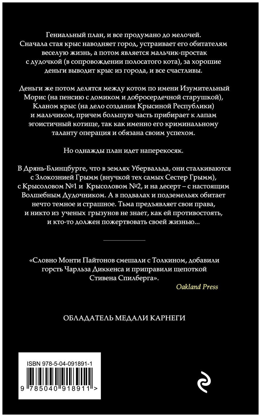 Довольно забавная, ироничная и немного философская сказка, где Терри Пратчетт рассказывает легенду о крысолове с дудочкой на новый лад. Что бывает, когда крысы вступают в сговор с глуповатым на вид мальчишкой-дудочником? А крысы-то не простые: говорящие, думающие, многие умеют читать надписи на банках, коробках, обрывках бумаги, которыми завалена мусорная куча на родном дворе. А мыслящей крысе обязательно нужно имя: Персики, Сардины, Гуляш, Гуталин, Большие Скидки. Есть среди них и крысеныш-мыслитель Фасоль Опасно-для-Жизни. Но блестящая мысль о бизнесе, основанном на изгнании из различных городов грызунов, приходит в голову ушлого кота, изумительного Мориса, авантюриста слегка нечистого на лапу (к лапке денежка почему-то пристает). И вот хорошо разработанная и обкатанная схема дает сбой в городе Дрянь-Блинцбурге. А встреча с Злокознией Грымм, девочкой, постоянно ищущей приключения не только на свою голову, не оставит ни единого шанса местным мошенникам. Неплохая развлекательная литература, с первых страниц заставляющая улыбаться. А первый эпизод с предусмотрительными грабителями - один из лучших в книге. Сказка на пару вечеров, для хорошего настроения.