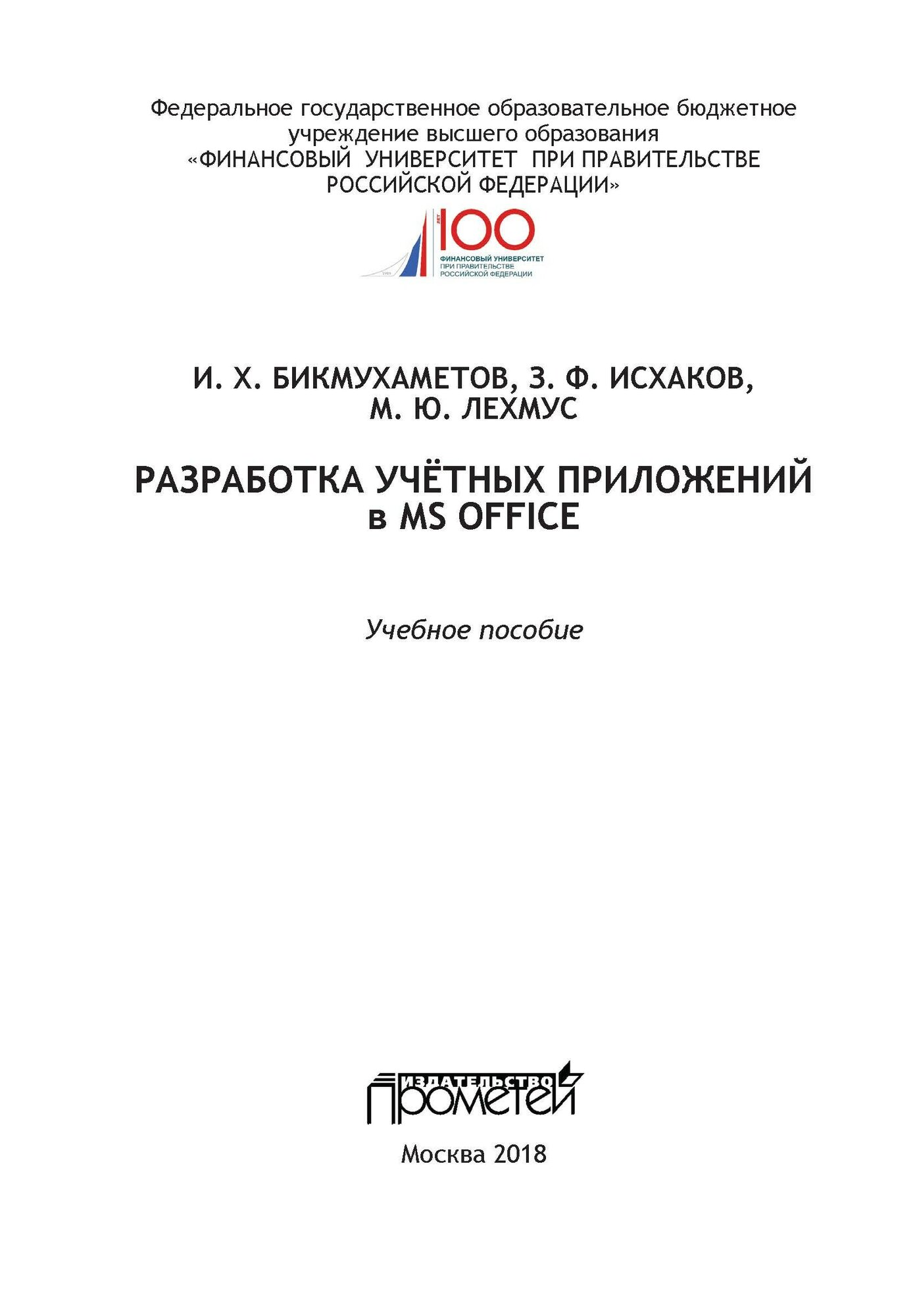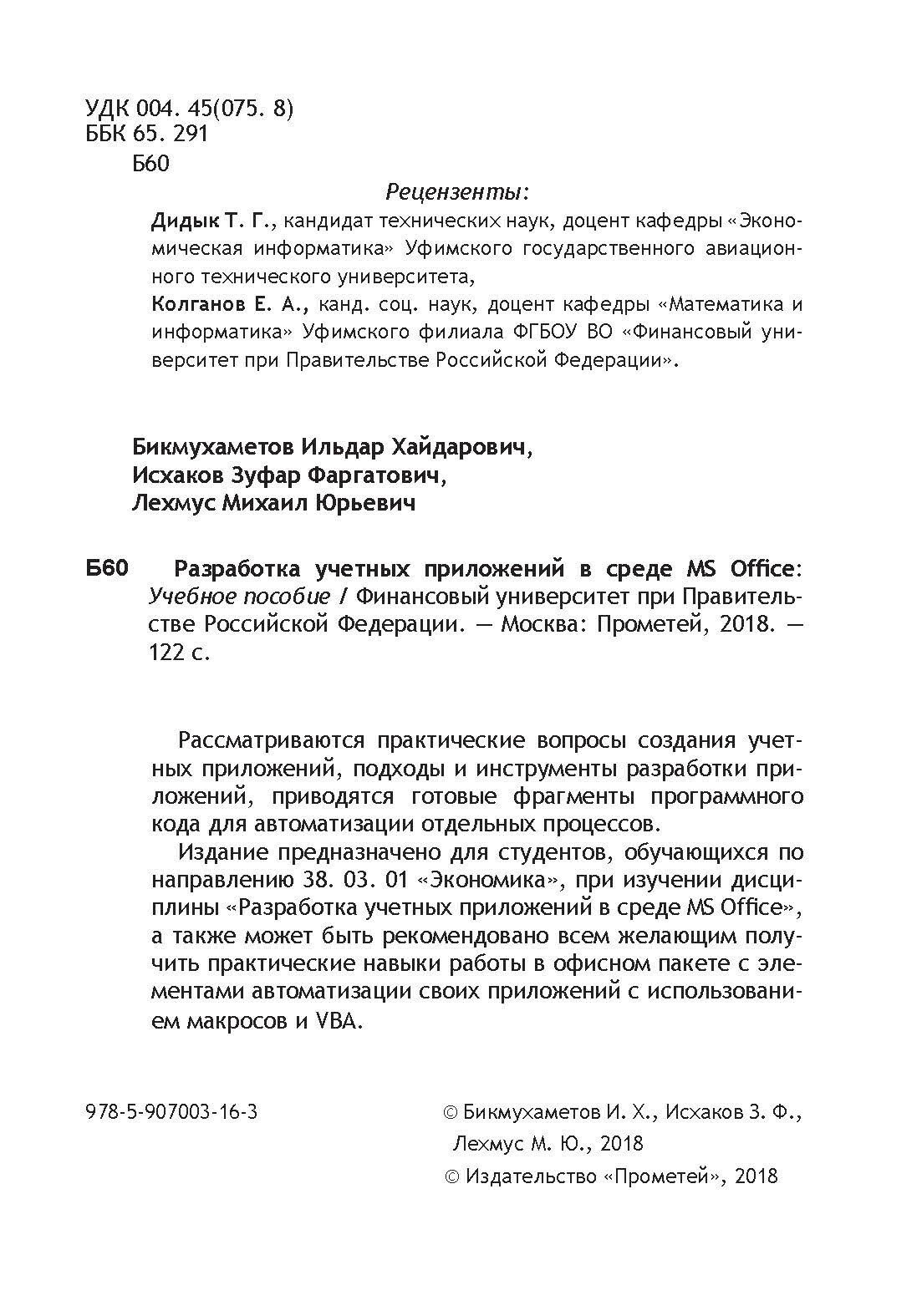 Разработка учетных приложений в среде MS Office (И. Х. Бикмухаметов); Прометей, 2018
