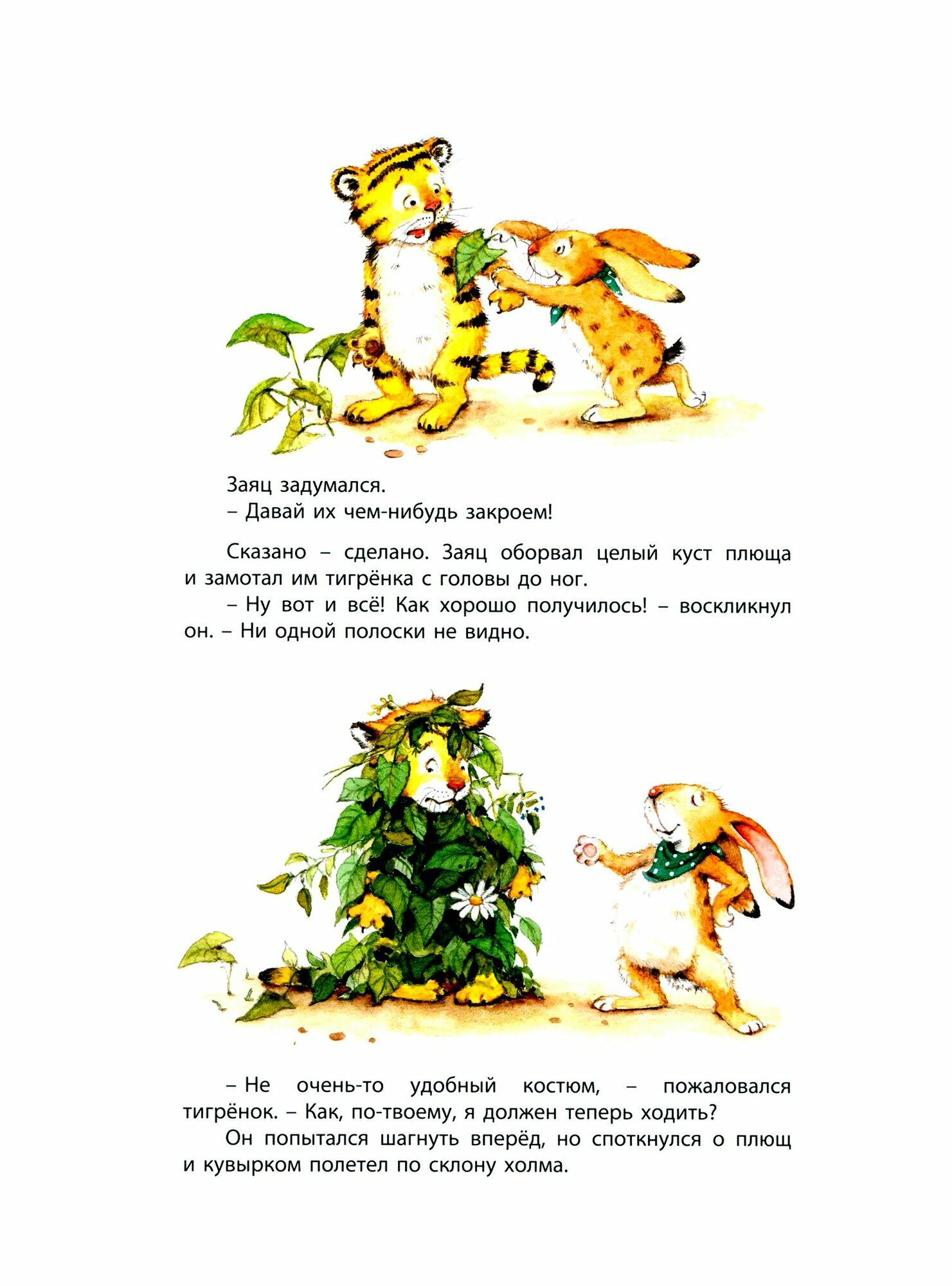 Незамысловатая, добрая и наивная история о тигренке, который стеснялся своих полосок. Что он только ни делал: закрашивал и отмывал их, маскировал, купался в грязи. В итоге он понял, что его полоски нужны и полезны.