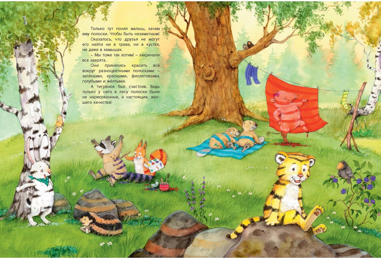 Смешную историю о том, как тигрёнок хотел избавиться от своих полосок, сочинила и нарисовала Марина Кремер, известный немецкий писатель и художник-иллюстратор.