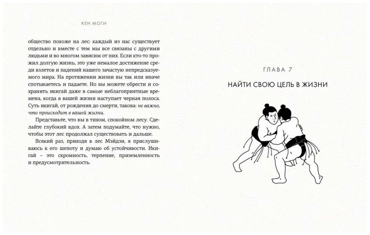 Добрый день! ОООООЧЕНЬ неожиданная история с этой книгой. Я ее случайно взяла по пути к скаймейке, уже имея в руках книг 5 на просмотр. в итоге пполтора часа читала только ее и в последствии купила. Я слышала про икигай и видела картинку...но после прочтения этой книги, которая написана японцем, что важно, я совершенно по-иному понимаю это слово. кроме самого понятия икигай, вы встретите на страницах книги и другие японские слова и понятия....вся книга пронизана спокойствией и глубиной японской философии...не ждешь рассказов про керамику и сумоистов, но они так кстати и без них совершенно не так ярко воспринималось бы это понятие. заканчиваешь читать книгу и начинаешь снова. очень увлекательно. и найти свой икигай можно....проще, чем казалось