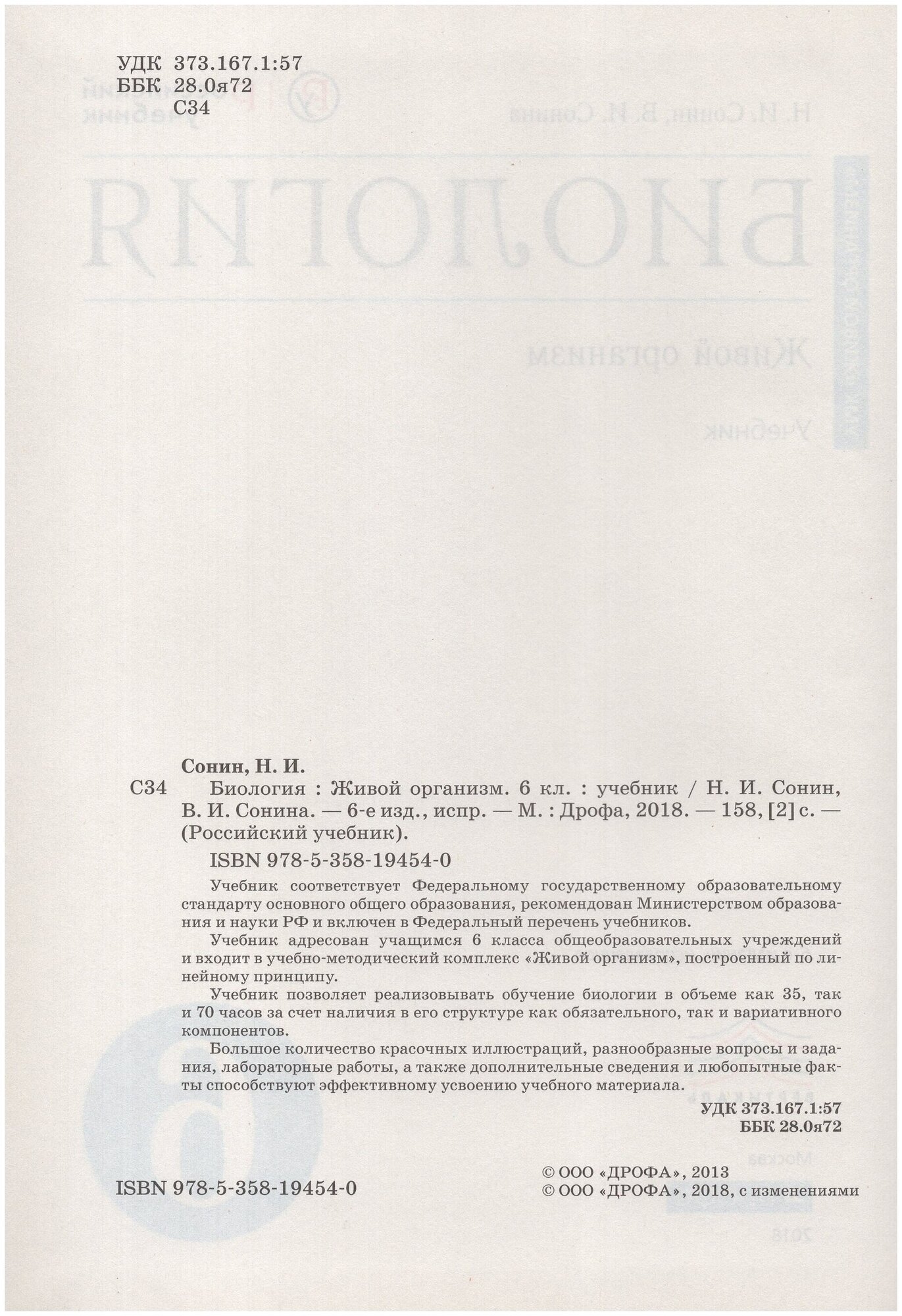 Биология. 6 класс. Живой организм. Учебник (Синий). ВЕРТИКАЛЬ (Сонина В. И., Сонин Н. И.); Дрофа, 2018