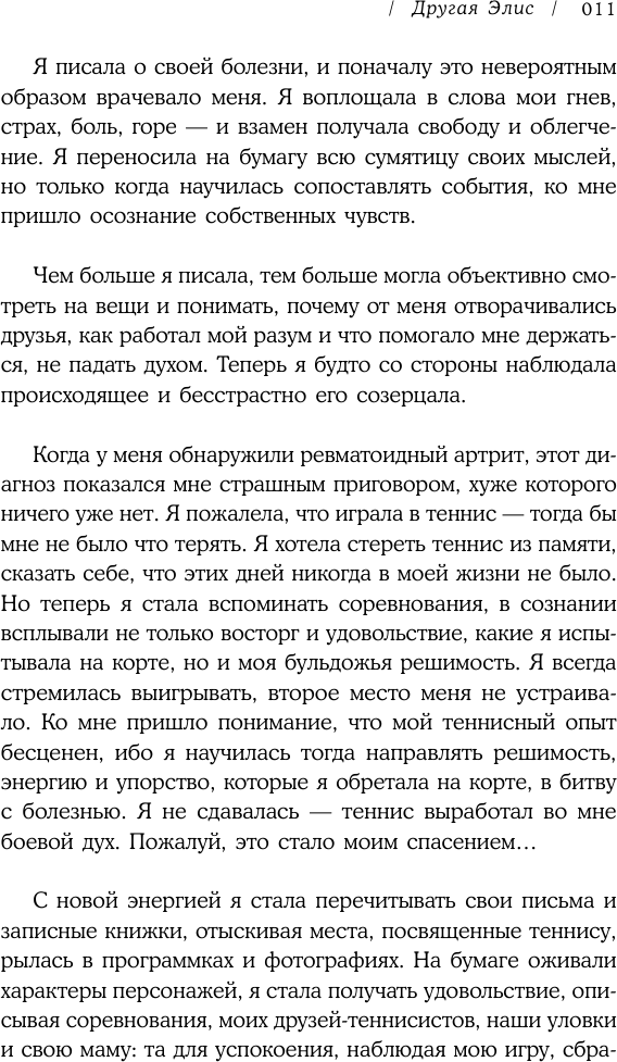 Отличная душевная книга! Думаю будет очень интересна больным РА, во многом узнаешь себя. И будет полезна близким любям и родственникам хоть как то уже понять любимого человека, потому что многие жалуются, что близкие и родственники просто не понимают а иногда вообще умудряются не верить что человеку больно и плохо и сравнивают боль с тем как у них болит рука например или с обычным артритом у бабулек. Сам сюжет единственное какой то кривой, пол книги рассказа о том как она была здоровая в детстве играла в теннис, который можно было сократить до 1 главы, а вот период уже заболевшей резко обрывается на том, когда она хоть чуток отошла и книга заканчивается, хотя как раз этот период был бы интересней после периоды нытья и жаленья себя как раз можно было бы написать, о том что привыкаешь, о том как она работала, жила, как писала книги и личную жизнь.