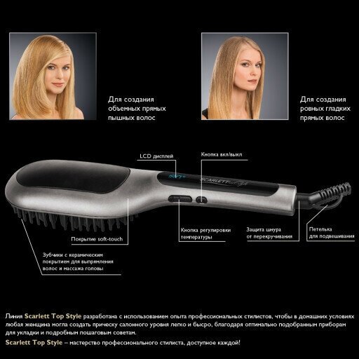 Расчёска-выпрямитель Scarlett изменит ваши представления об уходе за волосами. Укладывайте и сушите волосы легко, быстро и безопасно одним прибором, без использования вспомогательных приборов.