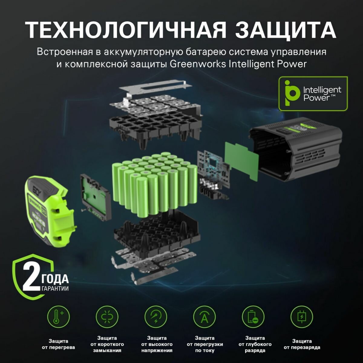 Аккумуляторная батарея GreenWorks - это литий-ионная батарея последнего поколения, выполненная по новейшей технологии и используемая в технике GreenWorks. Батарея состоит из ячеек LG и снабжается встроенным электронным чипом. Чип предназначен для защиты от перезаряда, перегрева и глубокого разряда. 2000 циклов заряда-разряда гарантируют долгий срок службы. При коммерческом использовании равно приблизительно 8-ми годам работы. Литий-ионная батарея не подвержена эффекту памяти - потери ёмкости при подзарядке не полностью разрядившейся батареи. Важным преимуществом является быстрый заряд батареи. Для удобства, батарея снабжена индикатором уровня заряда и ударопрочным корпусом для защиты от механических повреждений.