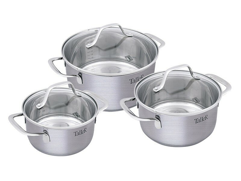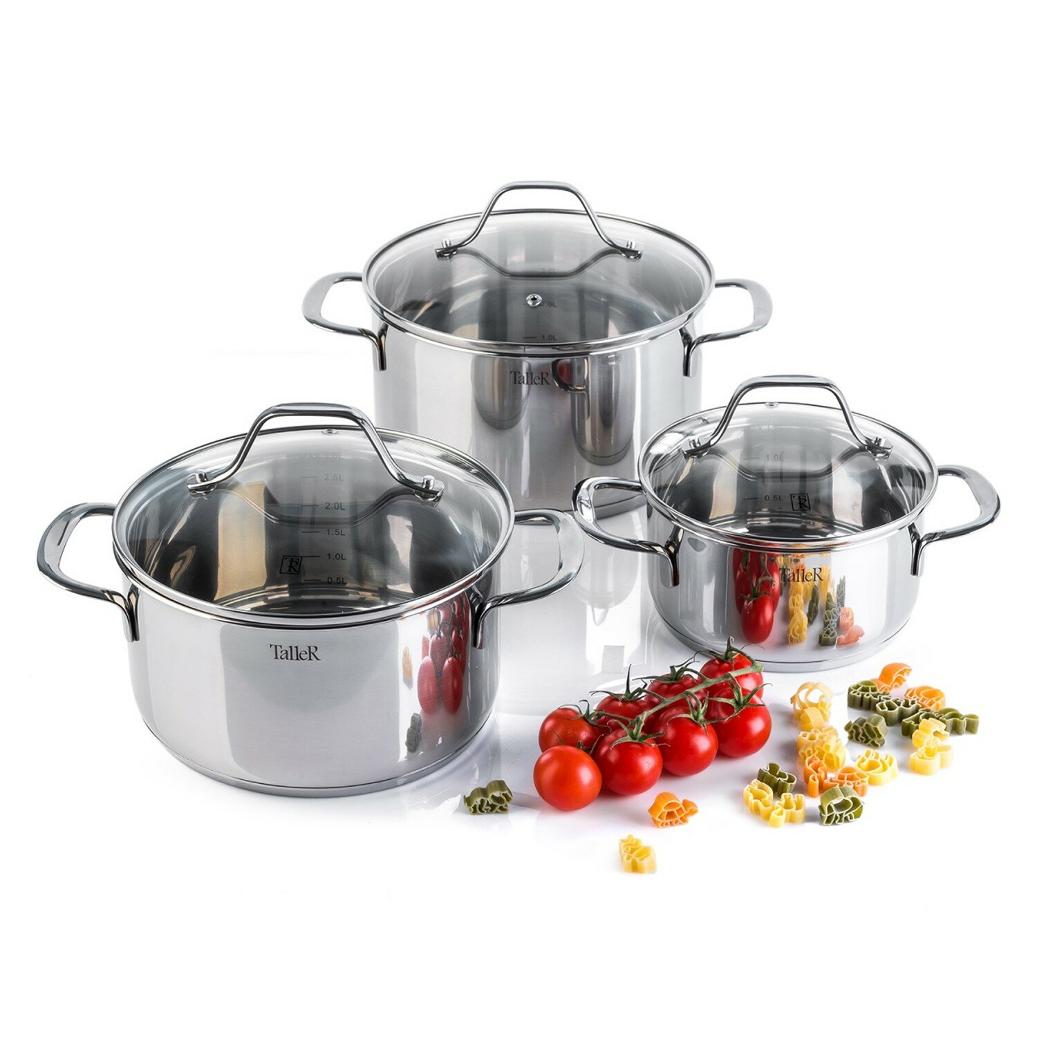 - Набор посуды Taller Брилон TR-1060, 6пр(кастрюли с крышками 4л, 3л, 1,5 л), нерж.сталь обзор