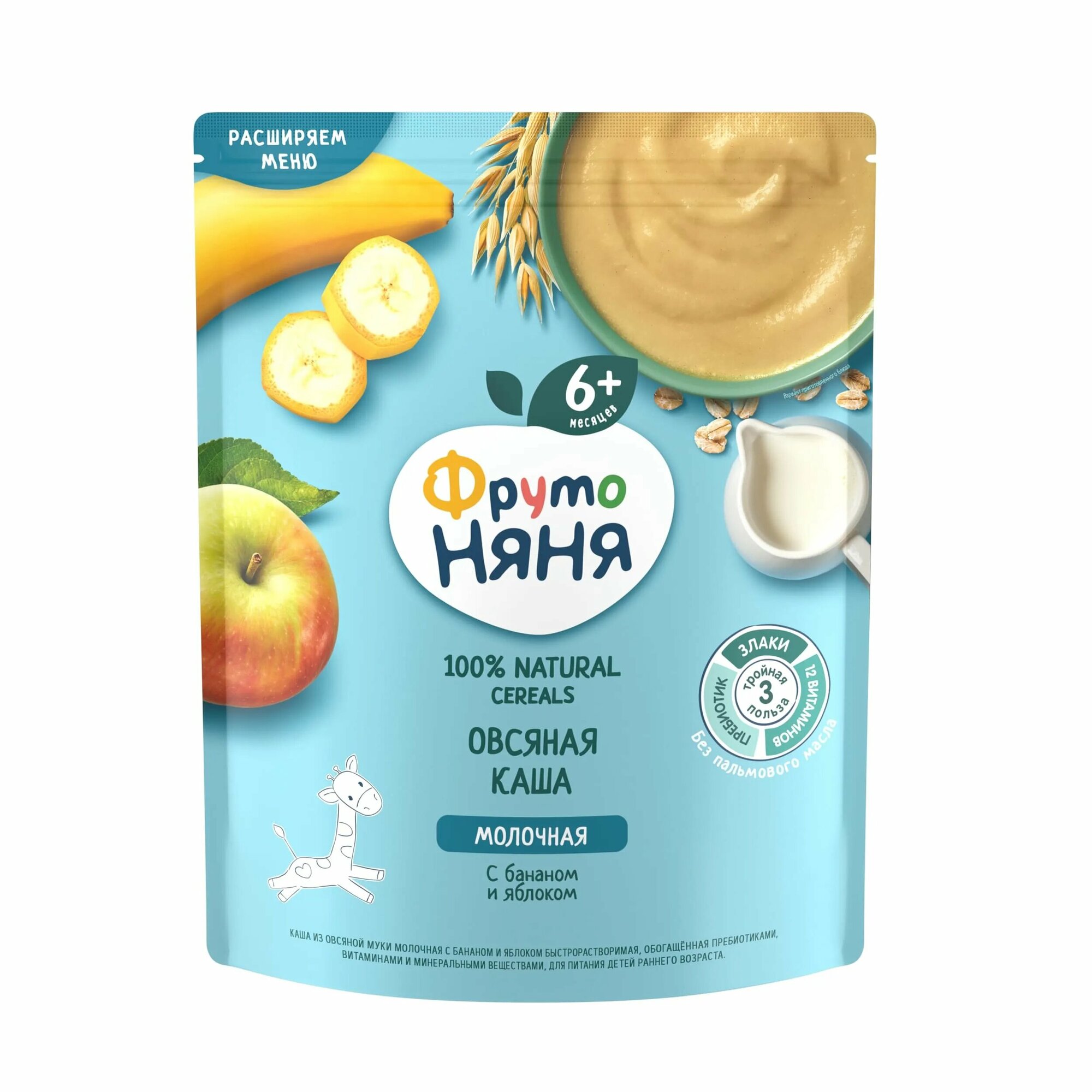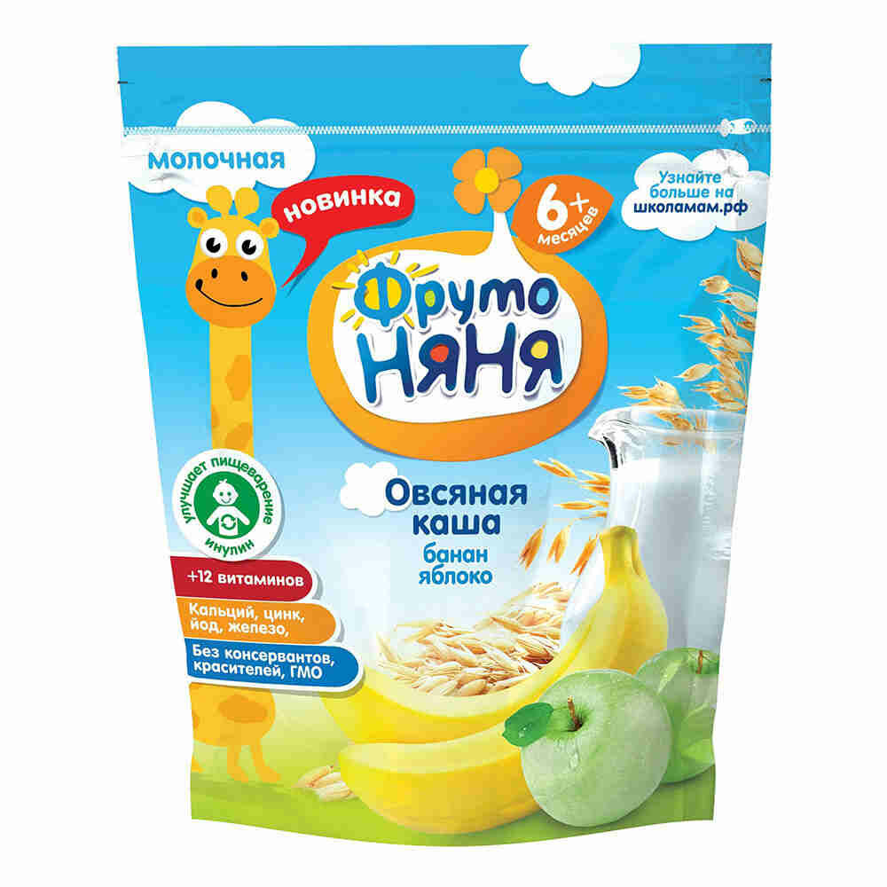 ФрутоНяня каша овсяная с яблоками и бананами молочная быстрорастворимая, обогащённая пребиотиками, витаминами и минеральными веществами, для питания детей раннего возраста.