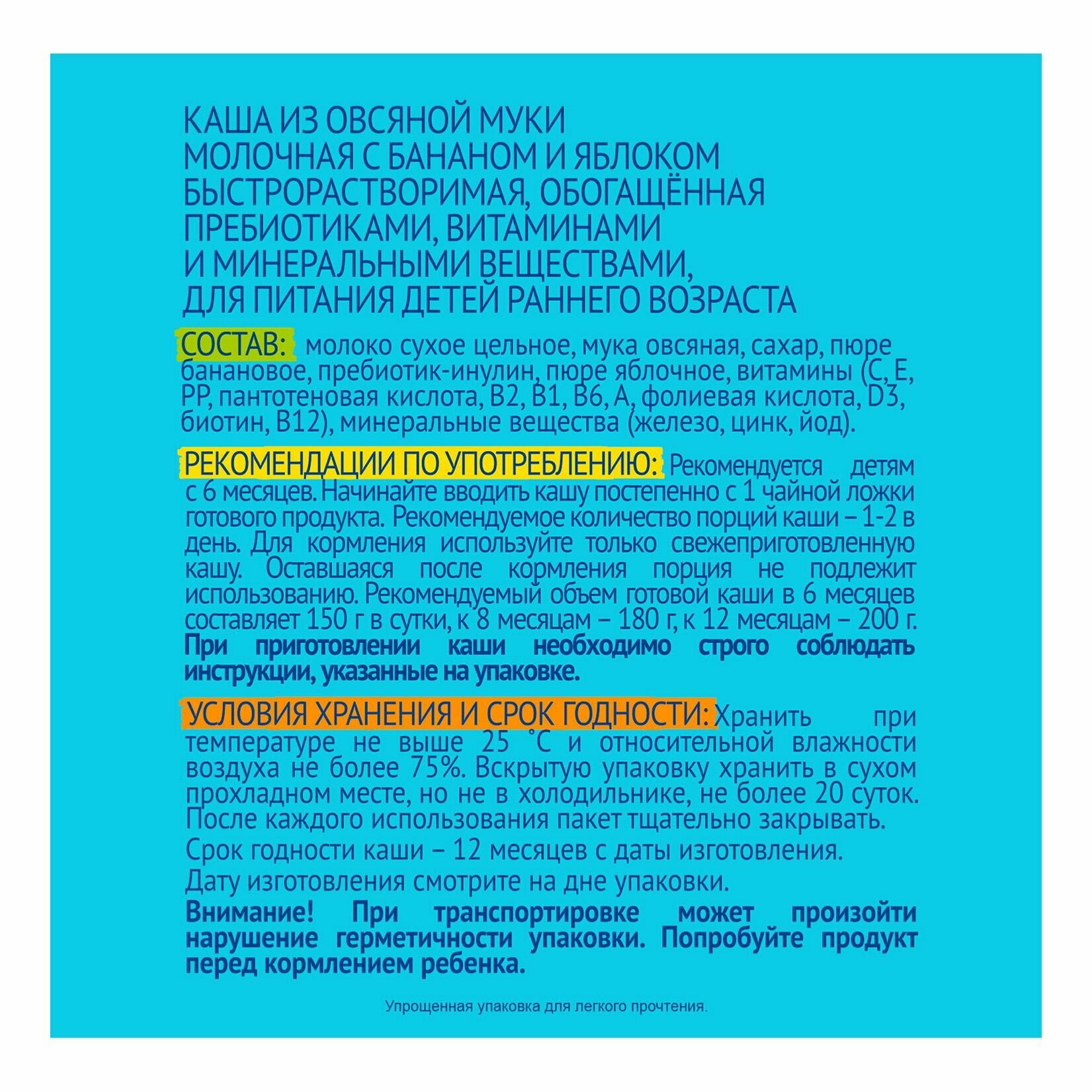 | Состав | Молоко сухое цельное, мука овсяная, сахар, пюре банановое, пребиотик-инулин, пюре яблочное концентрированное, витамины (C, E, PP, пантотеновая кислота, B1, B2, B6, A, фолиевая кислота, D3, биотин, B12), минеральные вещества (железо, цинк, йод). |