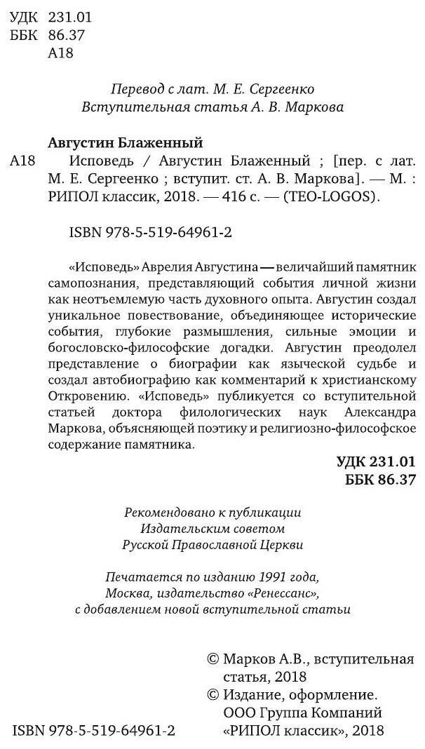 "Исповедь" Аврелия Августина - величайший памятник самопознания, представляющий события личной жизни как неотъемлемую часть духовного опыта. Августин создал уникальное повествование, объединяющее исторические события, глубокие размышления, сильные эмоции и богословско-философские догадки. Августин преодолел представление о биографии как языческой судьбе и создал автобиографию как комментарий к христианскому Откровению. "Исповедь" публикуется со вступительной статьей доктора филологических наук Александра Маркова, объясняющей поэтику и религиозно-философское содержание памятника.