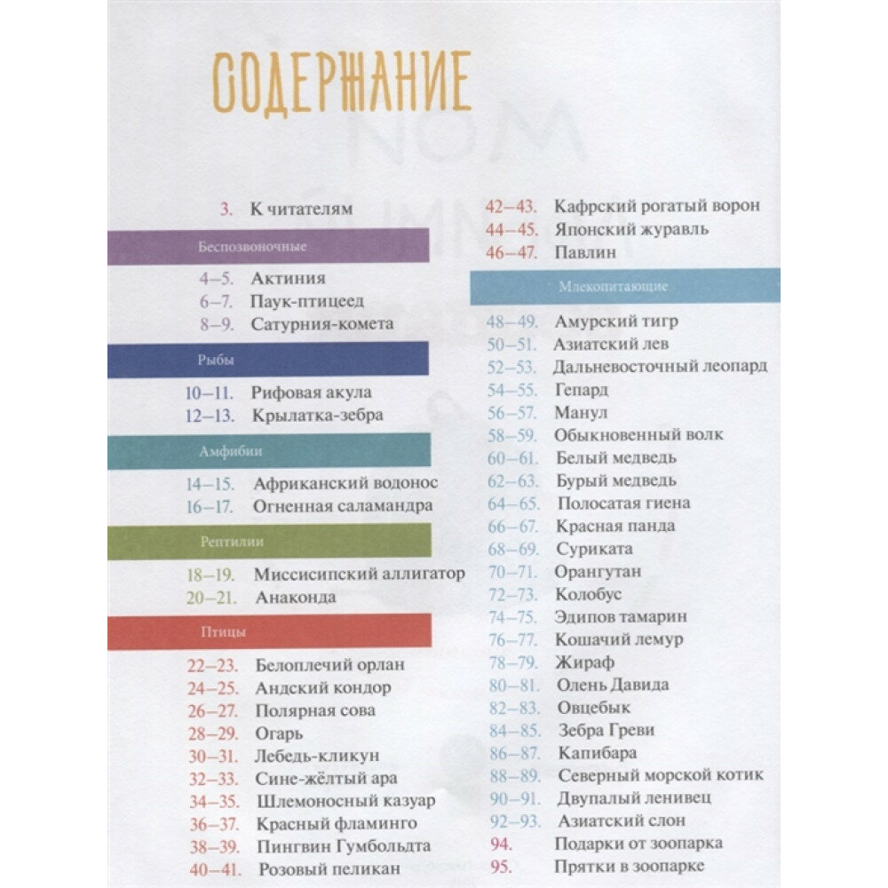 Замечательная книга с предисловием Генерального директора Московского зоопарка! Тщательно продуманное содержание. Все представлено как прогулка по зоопарку! Какой-то нерадивый посетитель уронил свой рюкзак в аквариум к актиниям, и вот рюкзачок путешествовал от одного обитателя к другому, пока наконец не был найден смотрителем. Про каждого животного есть короткая статья, мини-анкета с важными фактами, информация, где найти его в Московском зоопарке и загадка (с отгадкой). Например, мы узнаем как правильно называть детеныша лебедя, что такое медвежье дерево, какое место в клине занимают слабые журавли и многое другое! Для каждого раздела есть свое обозначение, нарисованное в левом верхнем углу разворота. В общем, книга действительно хорошо продумана и очень удобно устроена.
