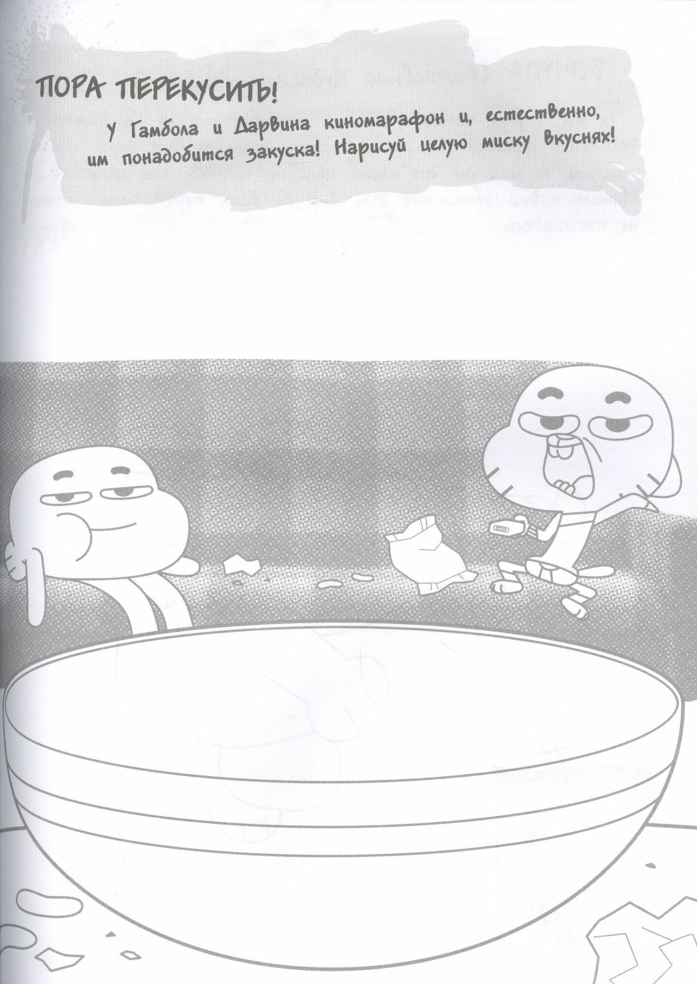 Довольно плотная, большая тетрадь, напоминающая скетбук. Иллюстрации, как и в других тетрадях про Гамбола, черно-белые. В тетради представлены поля для рисования в виде заданий: где-то есть лабиринты, где-то задания не связанные с рисованием. Забавно, что в книге про рисование нет поэтапного показа того, как нарисовать главных персонажей мультфильма (только по клеточкам).