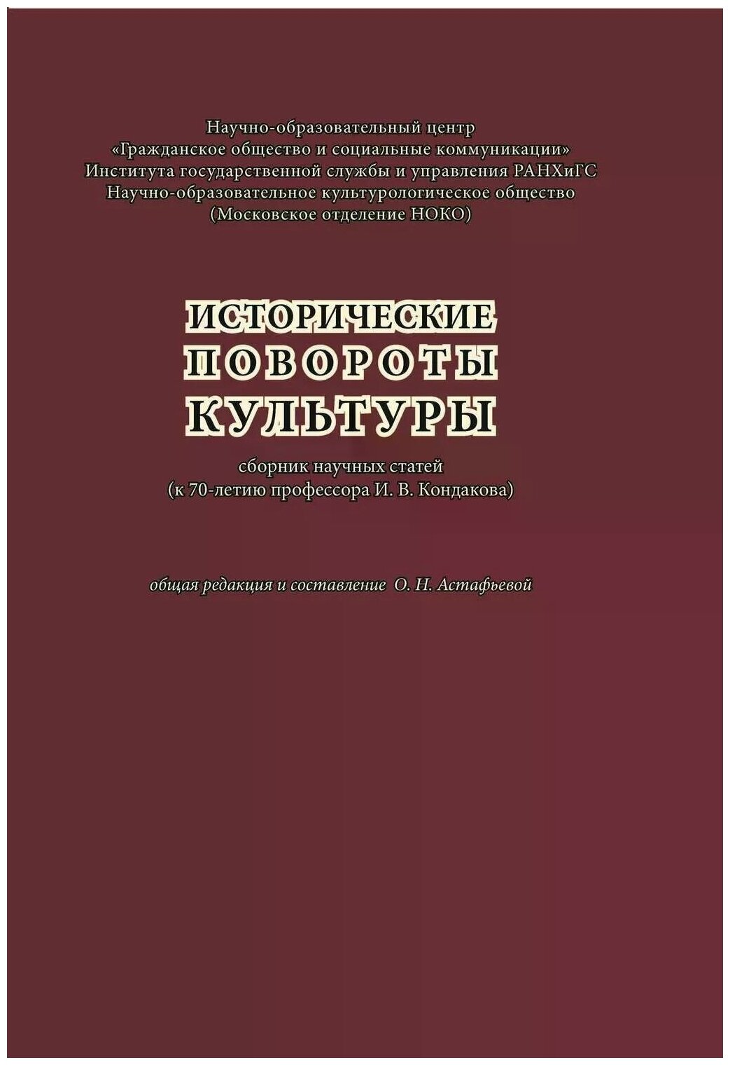 Сборник научных статей, посвященный 70-летию со дня рождения известного ученого — философа и культуролога, историка культуры, доктора философских наук, профессора Игоря Вадимовича Кондакова — включает статьи и материалы участников Всероссийской конференции «Исторические повороты культуры», проведенной в рамках деятельности научно-методо-логического семинара «Культура и культурная политика» (ИГСУ РАНХиГС) совместно с Научно-образовательным культурологическим обществом (декабрь 2017 года). В числе авторов статей — ученые и научные работники, профессора вузов России и зарубежных стран.